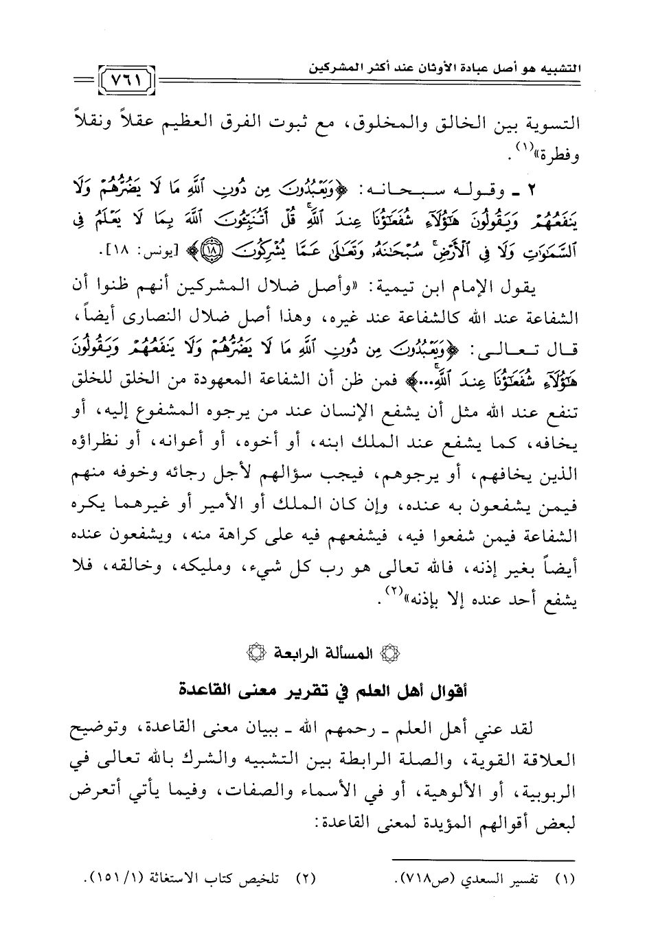 ٢ - وقوله سبحانه: {وَيَعْبُدُونَ مِنْ دُونِ اللَّهِ مَا لَا يَضُرُّهُمْ وَلَا يَنْفَعُهُمْ وَيَقُولُونَ هَؤُلَاءِ شُفَعَاؤُنَا عِنْدَ اللَّهِ قُلْ أَتُنَبِّئُونَ اللَّهَ بِمَا لَا يَعْلَمُ فِي السَّمَاوَاتِ وَلَا فِي الْأَرْضِ سُبْحَانَهُ وَتَعَالَى عَمَّا يُشْرِكُونَ (١٨)} [يونس: ١٨].