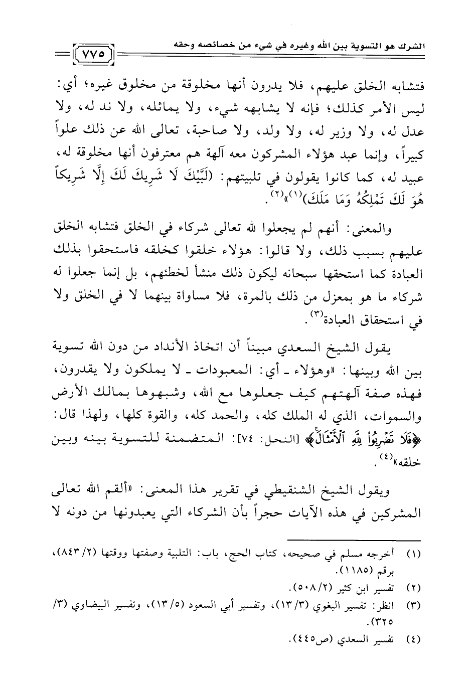 يقول الشيخ السعدي مبينًا أن اتخاذ الأنداد من دون الله تسوية بين الله وبينها: "وهؤلاء -أي: المعبودات- لا يملكون ولا يقدرون، فهذه صفة آلهتهم كيف جعلوها مع الله، وشبهوها بمالك الأرض والسموات، الذي له الملك كله، والحمد كله، والقوة كلها، ولهذا قال: {فَلَا تَضْرِبُوا لِلَّهِ الْأَمْثَالَ} [النحل: ٧٤]: المتضمنة للتسوية بينه وبين خلقه" (¬٤).
