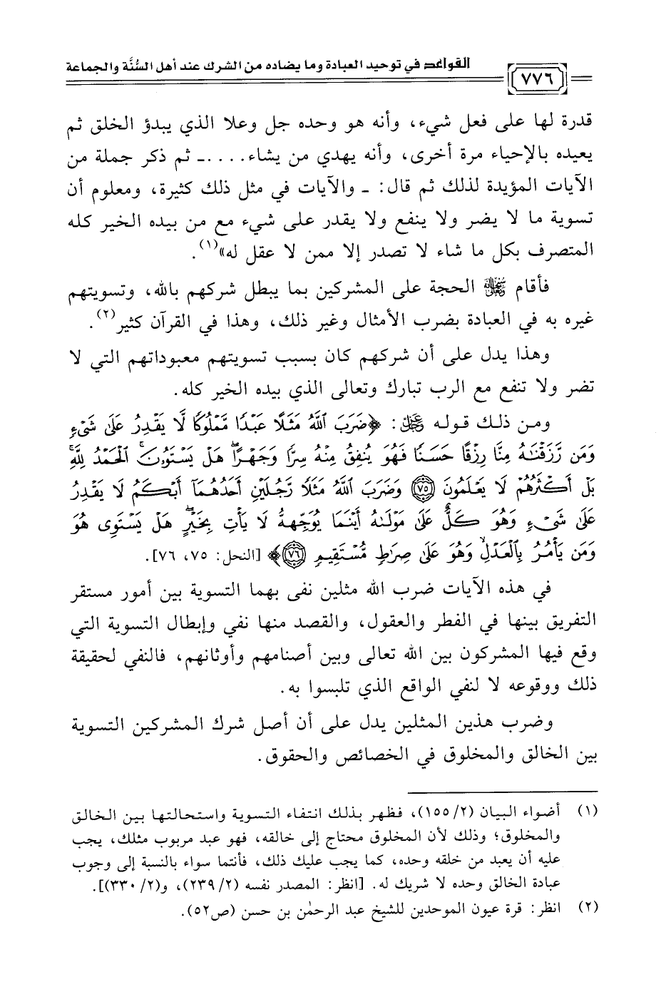 فأقام سبحانه وتعالى الحجة على المشركين بما يبطل شركهم بالله، وتسويتهم غيره به في العبادة بضرب الأمثال وغير ذلك، وهذا في القرآن كثير (¬٢).