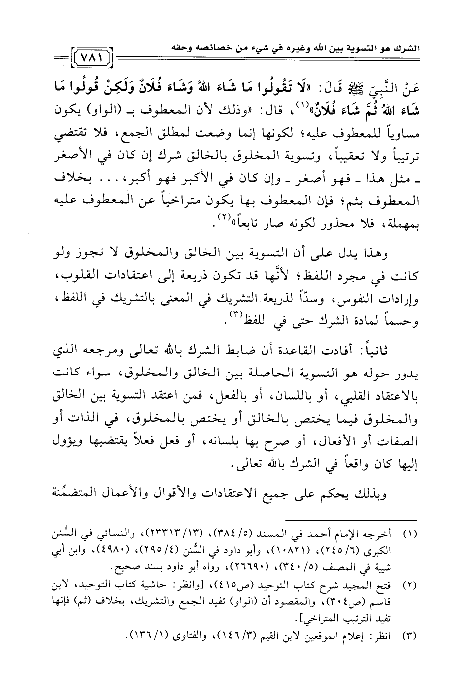 (¬٢) فتح المجيد شرح كتاب التوحيد (ص ٤١٥)، [وانظر: حاشية كتاب التوحيد، لابن قاسم (ص ٣٠٤)، والمقصود أن (الواو) تفيد الجمع والتشريك، بخلاف (ثم) فإنها تفيد الترتيب المتراخي].