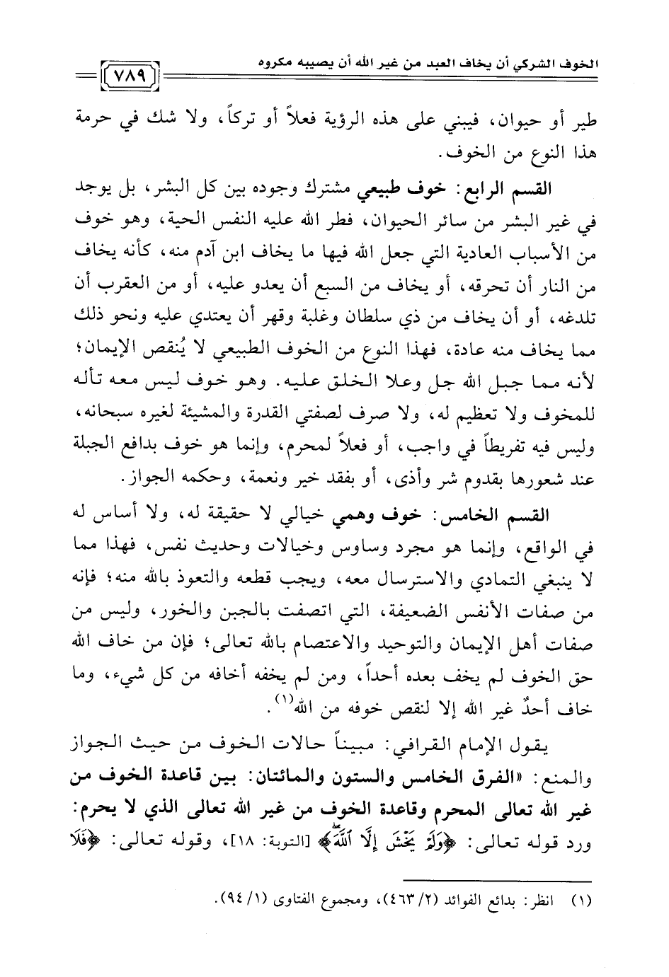 يقول الإمام القرافي: مبينًا حالات الخوف من حيث الجواز والمنع: "الفرق الخامس والستون والمائتان: بين قاعدة الخوف من غير الله تعالى المحرم وقاعدة الخوف من غير الله تعالى الذي لا يحرم: ورد قوله تعالى: {وَلَمْ يَخْشَ إِلَّا اللَّهَ} [التوبة: ١٨]، وقوله تعالى: {فَلَا