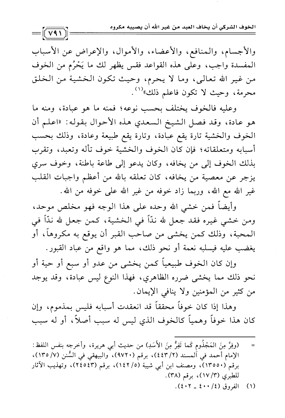 والأجسام، والمنافع، والأعضاء، والأموال، والإعراض عن الأسباب المفسدة واجب، وعلى هذه القواعد فقس يظهر لك ما يَحْرُم من الخوف من غير الله تعالى، وما لا يحرم، وحيث تكون الخشية من الخلق محرمة، وحيث لا تكون فاعلم ذلك" (¬١).