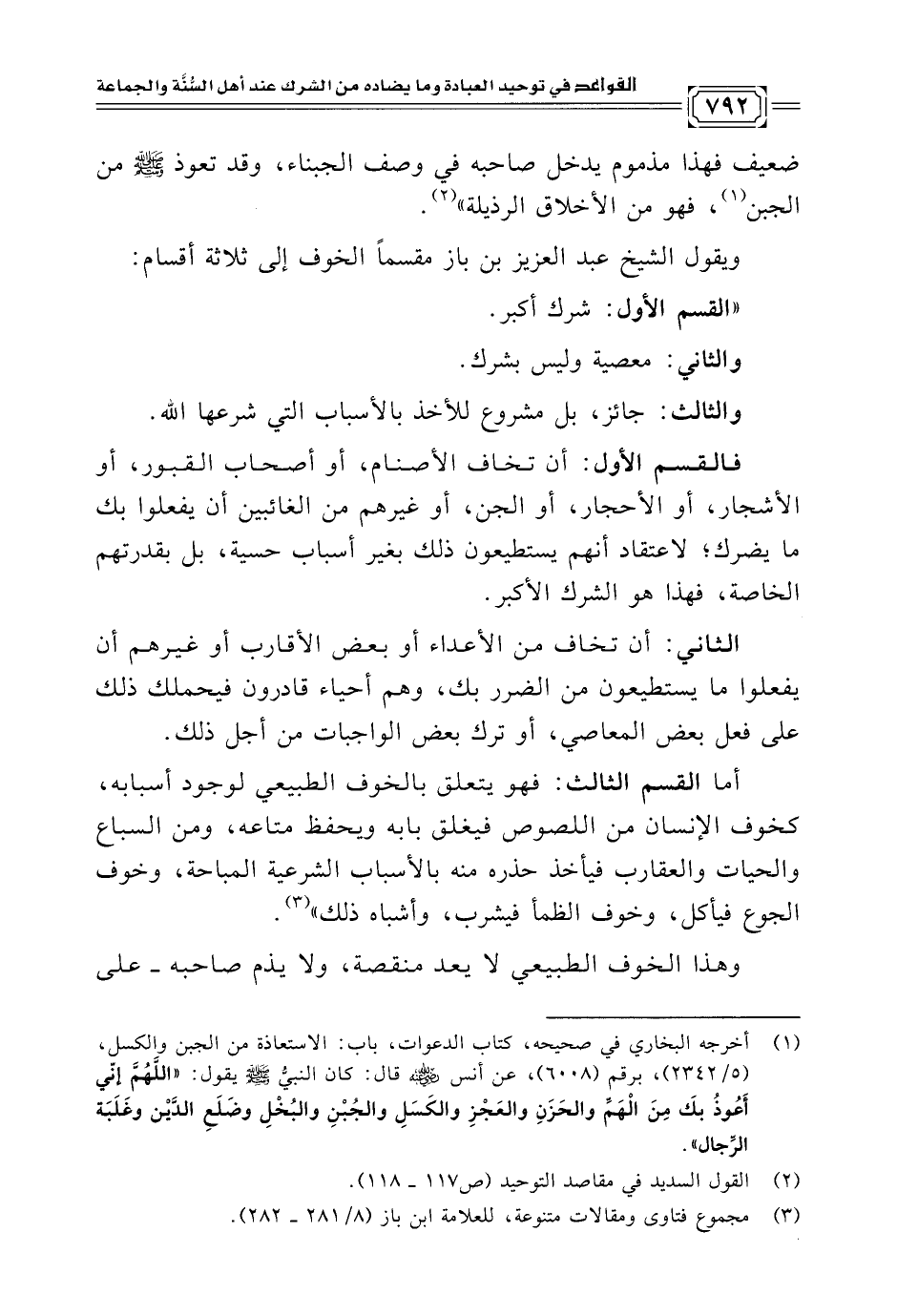 ويقول الشيخ عبد العزيز بن باز مقسمًا الخوف إلى ثلاثة أقسام: