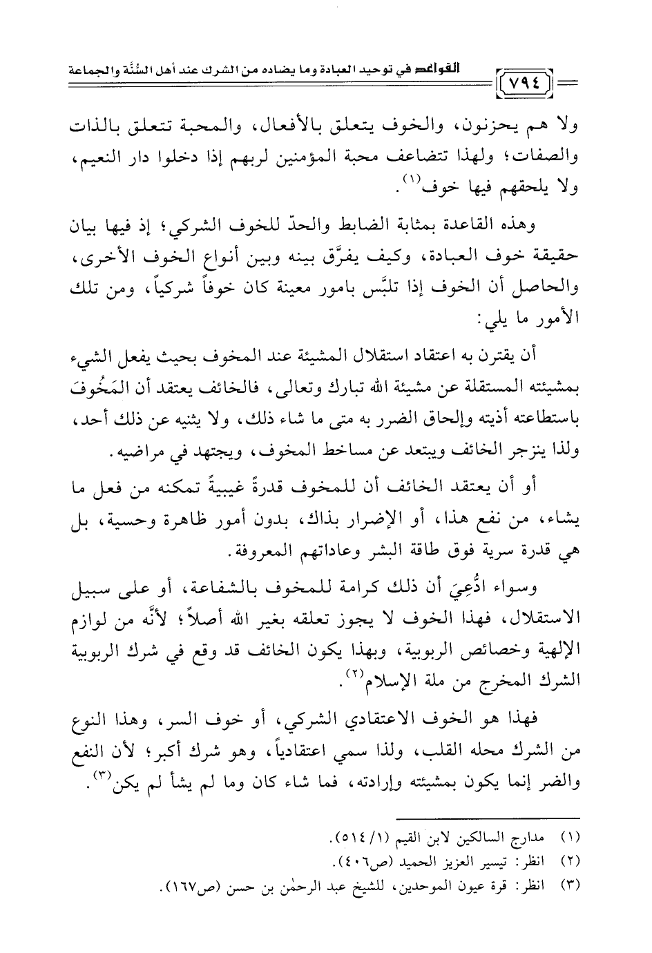 فهذا هو الخوف الاعتقادي الشركي، أو خوف السر، وهذا النوع من الشرك محله القلب، ولذا سمي اعتقاديًا، وهو شرك أكبر؛ لأن النفع والضر إنما يكون بمشيئته وإرادته، فما شاء كان وما لم يشأ لم يكن (¬٣).