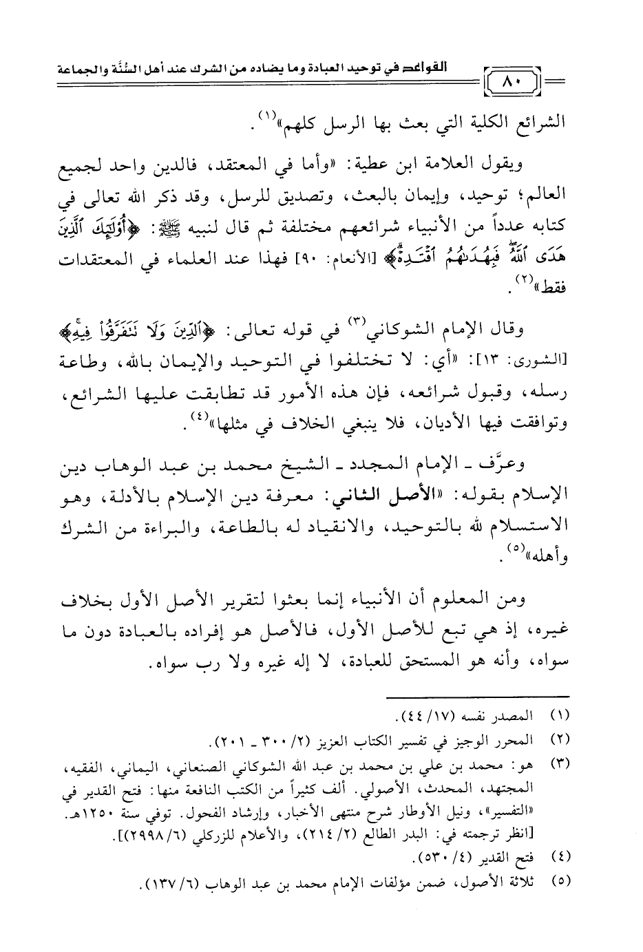 ويقول العلامة ابن عطية: "وأما في المعتقد، فالدين واحد لجميع العالم؛ توحيد، وإيمان بالبعث، وتصديق للرسل، وقد ذكر اللَّه تعالى في كتابه عددًا من الأنبياء شرائعهم مختلفة ثم قال لنبيه - صلى الله عليه وسلم -: {أُولَئِكَ الَّذِينَ هَدَى اللَّهُ فَبِهُدَاهُمُ اقْتَدِهْ} [الأنعام: ٩٠] فهذا عند العلماء في المعتقدات فقط" (¬٢).