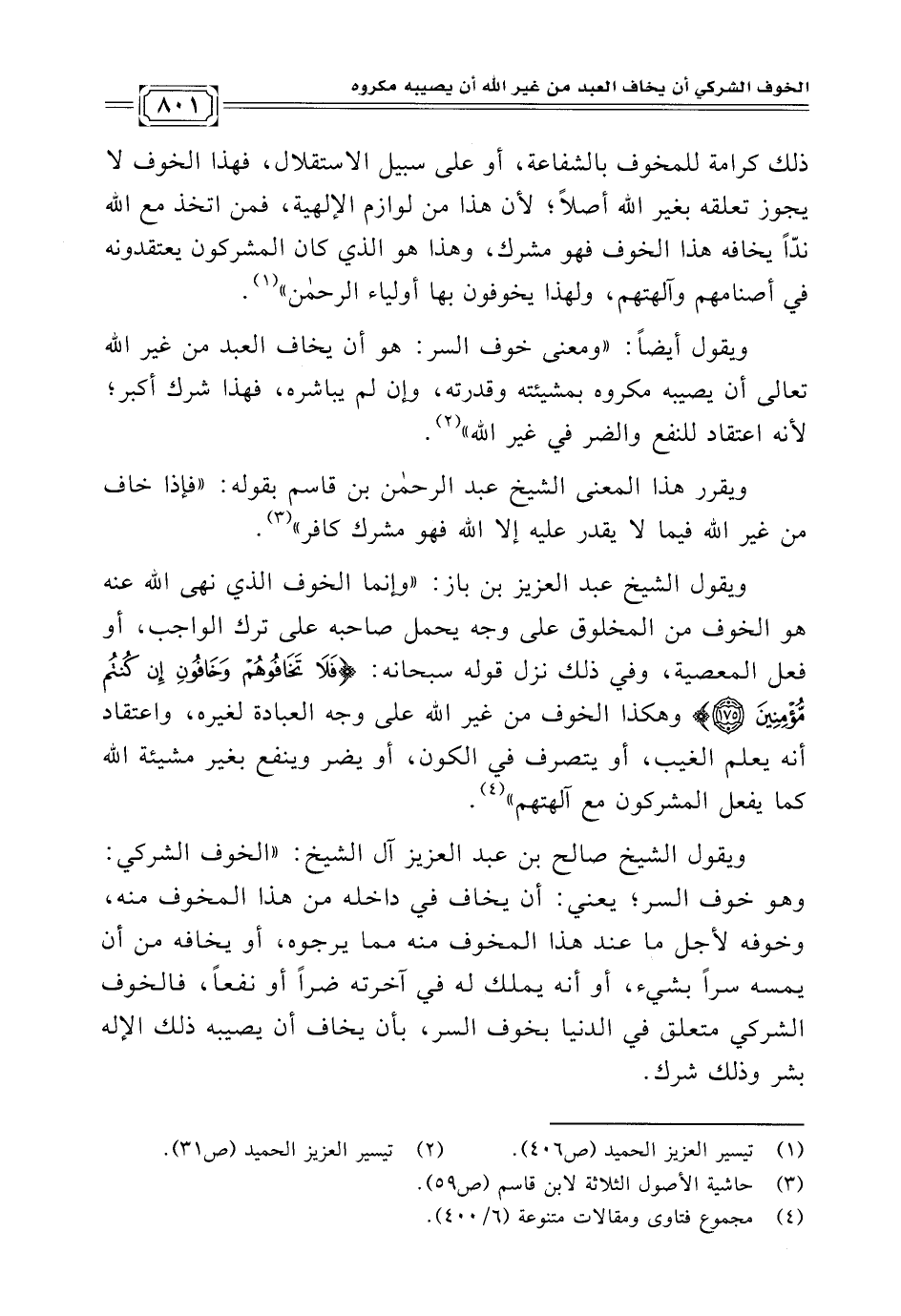 ويقول الشيخ عبد العزيز بن باز: "وإنما الخوف الذي نهى الله عنه هو الخوف من المخلوق على وجه يحمل صاحبه على ترك الواجب، أو فعل المعصية، وفي ذلك نزل قوله سبحانه: {فَلَا تَخَافُوهُمْ وَخَافُونِ إِنْ كُنْتُمْ مُؤْمِنِينَ (١٧٥)} وهكذا الخوف من غير الله على وجه العبادة لغيره، واعتقاد أنه يعلم الغيب، أو يتصرف في الكون، أو يضر وينفع بغير مشيئة الله كما يفعل المشركون مع آلهتهم" (¬٤).
