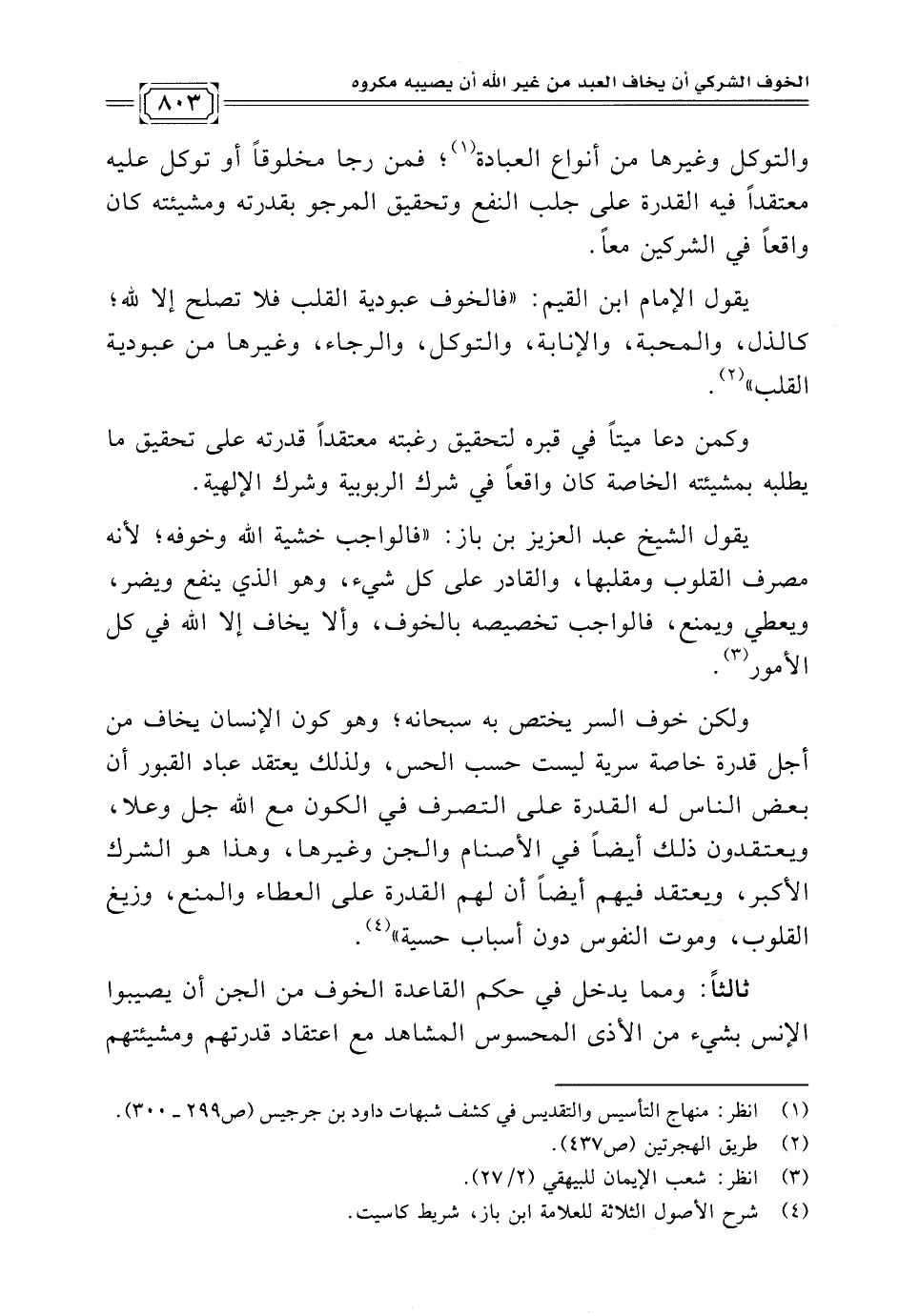 ولكن خوف السر يختص به سبحانه؛ وهو كون الإنسان يخاف من أجل قدرة خاصة سرية ليست حسب الحس، ولذلك يعتقد عباد القبور أن بعض الناس له القدرة على التصرف في الكون مع الله جل وعلا، ويعتقدون ذلك أيضًا في الأصنام والجن وغيرها، وهذا هو الشرك الأكبر، ويعتقد فيهم أيضًا أن لهم القدرة على العطاء والمنع، وزيغ القلوب، وموت النفوس دون أسباب حسية" (¬٤).