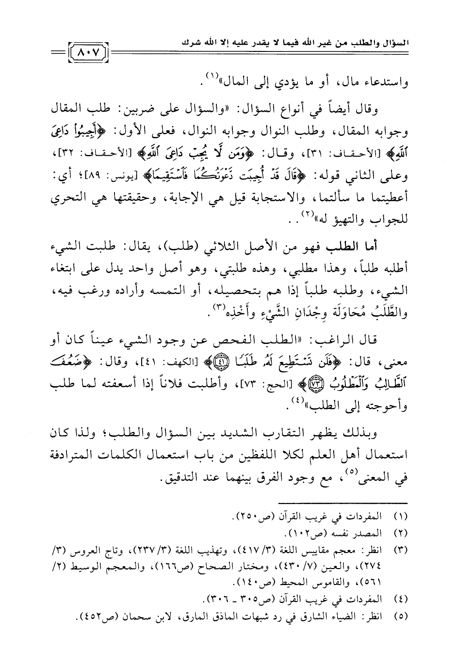 وبذلك يظهر التقارب الشديد بين السؤال والطلب؛ ولذا كان استعمال أهل العلم لكلا اللفظين من باب استعمال الكلمات المترادفة في المعنى (¬٥)، مع وجود الفرق بينهما عند التدقيق.