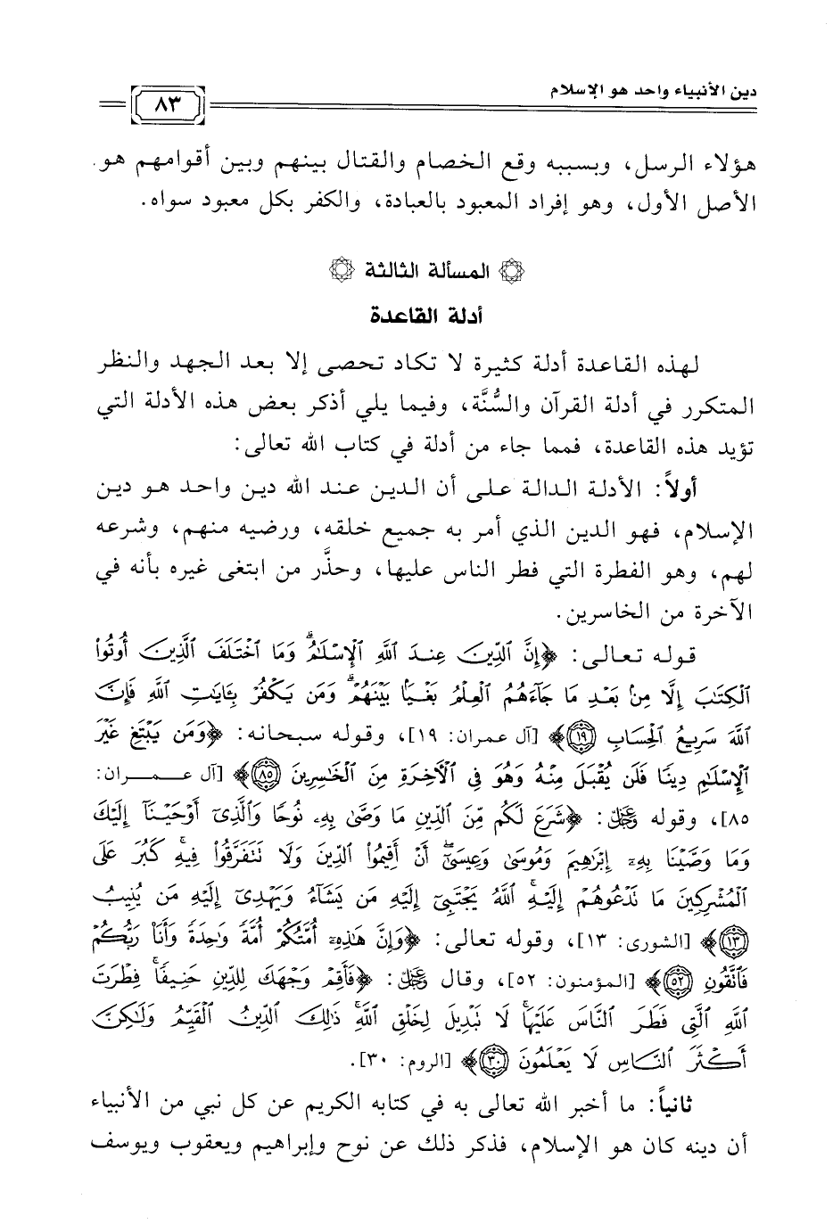 قوله تعالى: {إِنَّ الدِّينَ عِنْدَ اللَّهِ الْإِسْلَامُ وَمَا اخْتَلَفَ الَّذِينَ أُوتُوا الْكِتَابَ إِلَّا مِنْ بَعْدِ مَا جَاءَهُمُ الْعِلْمُ بَغْيًا بَيْنَهُمْ وَمَنْ يَكْفُرْ بِآيَاتِ اللَّهِ فَإِنَّ اللَّهَ سَرِيعُ الْحِسَابِ (١٩)} [آل عمران: ١٩] وقوله سبحانه: {وَمَنْ يَبْتَغِ غَيْرَ الْإِسْلَامِ دِينًا فَلَنْ يُقْبَلَ مِنْهُ وَهُوَ فِي الْآخِرَةِ مِنَ الْخَاسِرِينَ (٨٥)} [آل عمران: ٨٥] وقوله - عَزَّ وَجَلَّ -: {شَرَعَ لَكُمْ مِنَ الدِّينِ مَا وَصَّى بِهِ نُوحًا وَالَّذِي أَوْحَيْنَا إِلَيْكَ وَمَا وَصَّيْنَا بِهِ إِبْرَاهِيمَ وَمُوسَى وَعِيسَى أَنْ أَقِيمُوا الدِّينَ وَلَا تَتَفَرَّقُوا فِيهِ كَبُرَ عَلَى الْمُشْرِكِينَ مَا تَدْعُوهُمْ إِلَيْهِ اللَّهُ يَجْتَبِي إِلَيْهِ مَنْ يَشَاءُ وَيَهْدِي إِلَيْهِ مَنْ يُنِيبُ (١٣)} [الشورى: ١٣] وقوله تعالى: {وَإِنَّ هَذِهِ أُمَّتُكُمْ أُمَّةً وَاحِدَةً وَأَنَا رَبُّكُمْ فَاتَّقُونِ (٥٢)} [المؤمنون: ٥٢] وقال - عَزَّ وَجَلَّ -: {فَأَقِمْ وَجْهَكَ لِلدِّينِ حَنِيفًا فِطْرَتَ اللَّهِ الَّتِي فَطَرَ النَّاسَ عَلَيْهَا لَا تَبْدِيلَ لِخَلْقِ اللَّهِ ذَلِكَ الدِّينُ الْقَيِّمُ وَلَكِنَّ أَكْثَرَ النَّاسِ لَا يَعْلَمُونَ (٣٠)} [الروم: ٣٠].