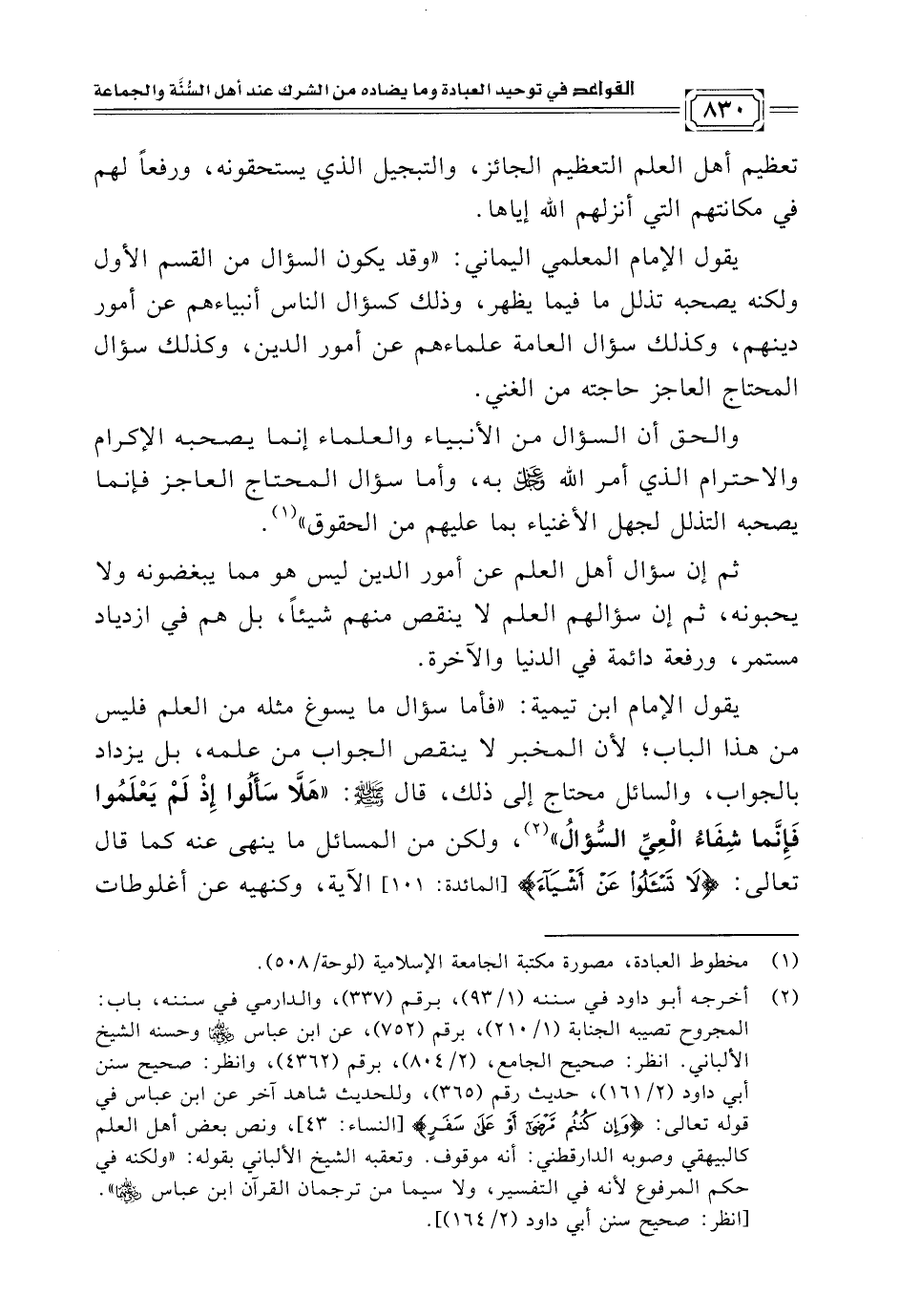 يقول الإمام ابن تيمية: "فأما سؤال ما يسوغ مثله من العلم فليس من هذا الباب؛ لأن المخبر لا ينقص الجواب من علمه، بل يزداد بالجواب، والسائل محتاج إلى ذلك، قال -صلى الله عليه وسلم-: "هَلَّا سَألوا إِذْ لَمْ يَعْلَمُوا فَإِنَّما شِفَاءُ الْعِيِّ السُّؤالُ" (¬٢)، ولكن من المسائل ما ينهى عنه كما قال تعالى: {لَا تَسْأَلُوا عَنْ أَشْيَاءَ} [المائدة: ١٠١] الآية، وكنهيه عن أغلوطات