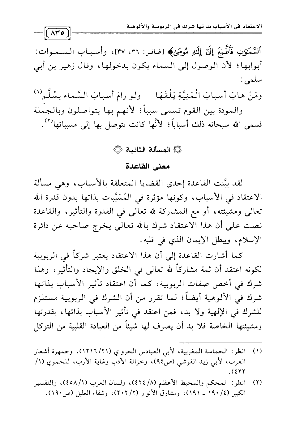لقد بيَّنت القاعدة إحدى القضايا المتعلقة بالأسباب، وهي مسألة الاعتقاد في الأسباب، وكونها مؤثرة في المُسَبَّبات بذاتها بدون قدرة الله تعالى ومشيئته، أو مع المشاركة لله تعالى في القدرة والتأثير، والقاعدة نصت على أن هذا الاعتقاد شرك بالله تعالى يخرج صاحبه عن دائرة الإسلام، ويبطل الإيمان الذي في قلبه.