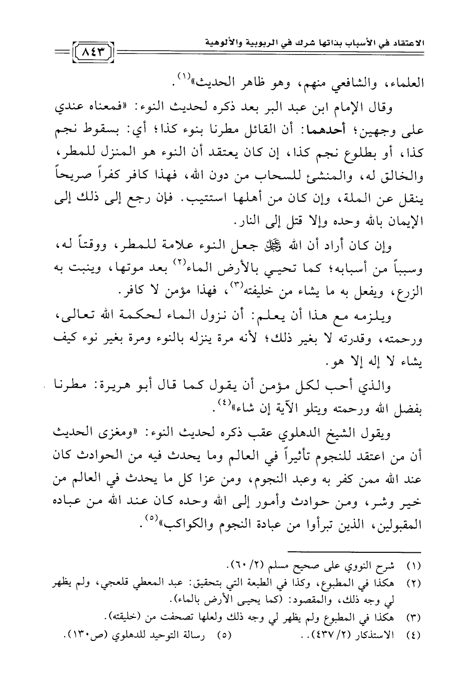 ويقول الشيخ الدهلوي عقب ذكره لحديث النوء: "ومغزى الحديث أن من اعتقد للنجوم تأثيرًا في العالم وما يحدث فيه من الحوادث كان عند الله ممن كفر به وعبد النجوم، ومن عزا كل ما يحدث في العالم من خير وشر، ومن حوادث وأمور إلى الله وحده كان عند الله من عباده المقبولين، الذين تبرأوا من عبادة النجوم والكواكب" (¬٥).
