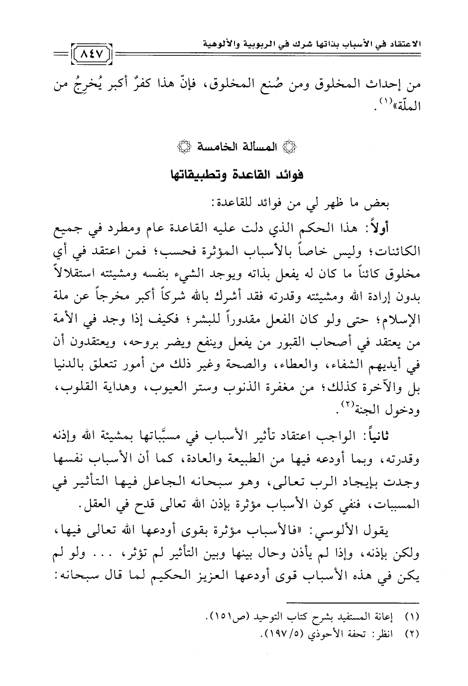 أولًا: هذا الحكم الذي دلت عليه القاعدة عام ومطرد في جميع الكائنات؛ وليس خاصًا بالأسباب المؤثرة فحسب؛ فمن اعتقد في أي مخلوق كائنًا ما كان له يفعل بذاته ويوجد الشيء بنفسه ومشيئته استقلالًا بدون إرادة الله ومشيئته وقدرته فقد أشرك بالله شركًا أكبر مخرجًا عن ملة الإسلام؛ حتى ولو كان الفعل مقدورًا للبشر، فكيف إذا وجد في الأمة من يعتقد في أصحاب القبور من يفعل وينفع ويضر بروحه، ويعتقدون أن في أيديهم الشفاء، والعطاء، والصحة وغير ذلك من أمور تتعلق بالدنيا بل والآخرة كذلك؛ من مغفرة الذنوب وستر العيوب، وهداية القلوب، ودخول الجنة (¬٢).