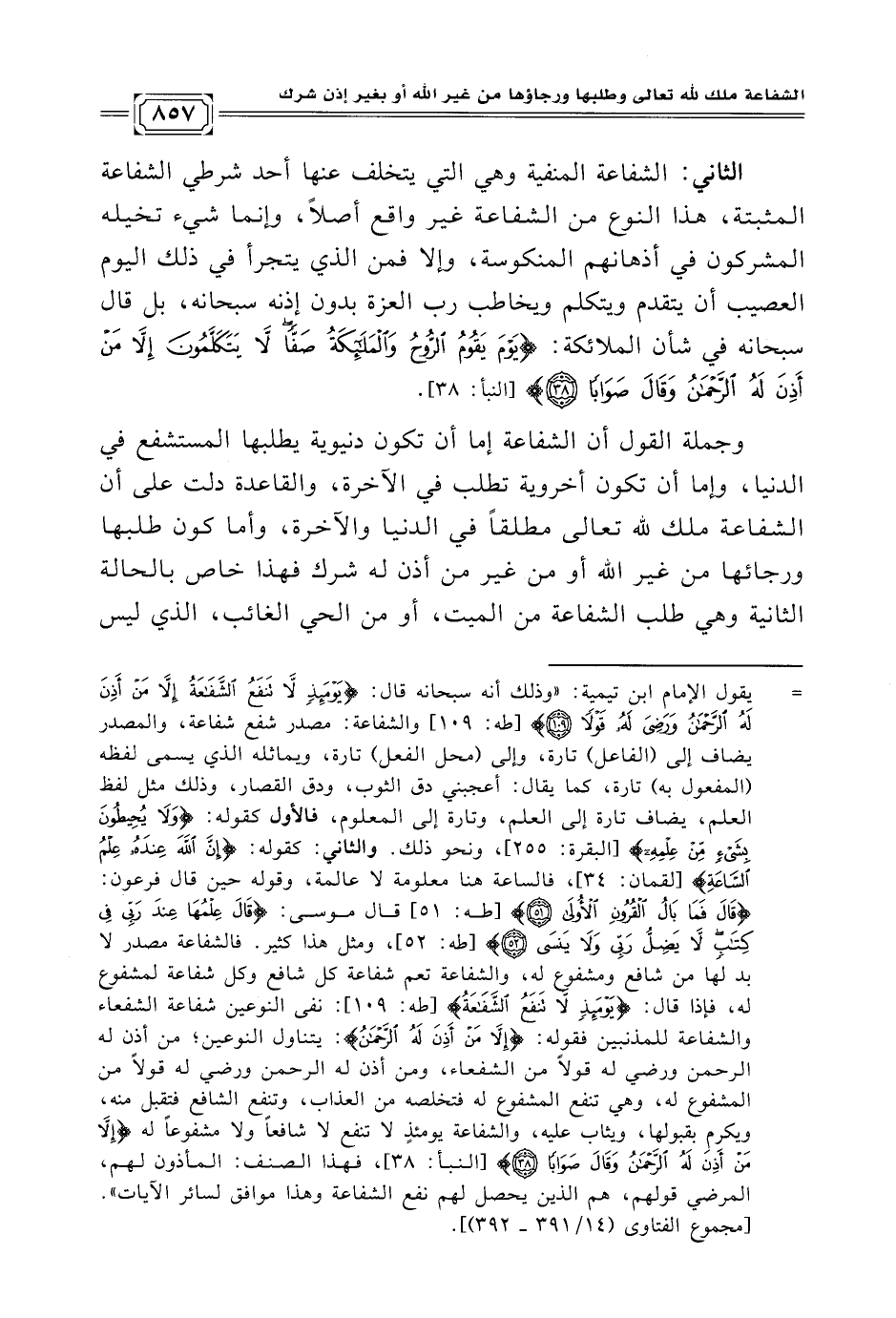 = يقول الإمام ابن تيمية: "وذلك أنه سبحانه قال: {يَوْمَئِذٍ لَا تَنْفَعُ الشَّفَاعَةُ إِلَّا مَنْ أَذِنَ لَهُ الرَّحْمَنُ وَرَضِيَ لَهُ قَوْلًا (١٠٩)} [طه: ١٠٩] والشفاعة: مصدر شفع شفاعة، والمصدر يضاف إلى (الفاعل) تارة، وإلى (محل الفعل) تارة، ويماثله الذي يسمى لفظه (المفعول به) تارة، كما يقال: أعجبني دق الثوب، ودق القصار، وذلك مثل لفظ العلم، يضاف تارة إلى العلم، وتارة إلى المعلوم، فالأول كقوله: {وَلَا يُحِيطُونَ بِشَيْءٍ مِنْ عِلْمِهِ} [البقرة: ٢٥٥]، ونحو ذلك. والثاني: كقوله: {إِنَّ اللَّهَ عِنْدَهُ عِلْمُ السَّاعَةِ} [لقمان: ٣٤]، فالساعة هنا معلومة لا عالمة، وقوله حين قال فرعون: {قَالَ فَمَا بَالُ الْقُرُونِ الْأُولَى (٥١)} [طه: ٥١] قال موسى: {قَالَ عِلْمُهَا عِنْدَ رَبِّي فِي كِتَابٍ لَا يَضِلُّ رَبِّي وَلَا يَنْسَى (٥٢)} [طه: ٥٢]، ومثل هذا كثير. فالشفاعة مصدر لا بد لها من شافع ومشفوع له، والشفاعة تعم شفاعة كل شافع وكل شفاعة لمشفوع له، فإذا قال: {يَوْمَئِذٍ لَا تَنْفَعُ الشَّفَاعَةُ} [طه: ١٠٩]: نفى النوعين شفاعة الشفعاء والشفاعة للمذنبين فقوله: {إِلَّا مَنْ أَذِنَ لَهُ الرَّحْمَنُ}: يتناول النوعين؛ من أذن له الرحمن ورضي له قولًا من الشفعاء، ومن أذن له الرحمن ورضي له قولًا من المشفوع له، وهي تنفع المشفوع له فتخلصه من العذاب، وتنفع الشافع فتقبل منه، ويكرم بقبولها، ويثاب عليه، والشفاعة يومئذٍ لا تنفع لا شافعًا ولا مشفوعًا له {إِلَّا مَنْ أَذِنَ لَهُ الرَّحْمَنُ وَقَالَ صَوَابًا (٣٨)} [النبأ: ٣٨]، فهذا الصنف: المأذون لهم، المرضي قولهم، هم الذين يحصل لهم نفع الشفاعة وهذا موافق لسائر الآيات". [مجموع الفتاوى (١٤/ ٣٩١ - ٣٩٢)].
