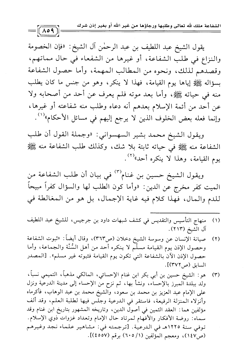 ويقول الشيخ حسين بن غنام (¬٣) في بيان أن طلب الشفاعة من الميت كفر مخرج عن الدين: "وأما كون الطلب لها والسؤال كفرًا مبيحًا للدم والمال، فهذا كلام فيه غاية الإجمال، بل هو من المغالطة في