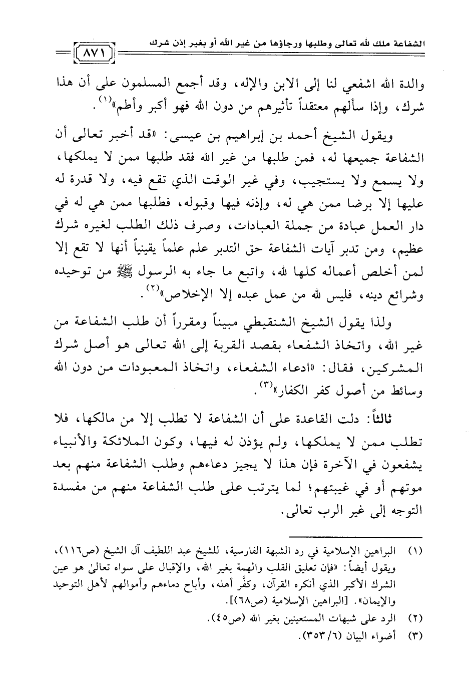 (¬١) البراهين الإسلامية في رد الشبهة الفارسية، للشيخ عبد اللطيف آل الشيخ (ص ١١٦)، ويقول أيضًا: "فإن تعليق القلب والهمة بغير الله، والإقبال على سواه تعالى هو عين الشرك الأكبر الذي أنكره القرآن، وكفر أهله، وأباح دماءهم وأموالهم لأهل التوحيد والإيمان". [اليراهين الإسلامية (ص ٦٨)].