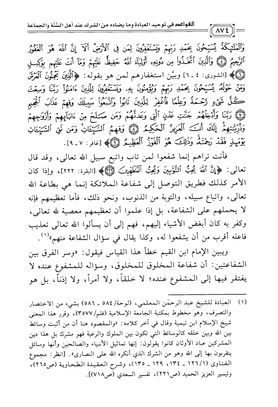 (¬١) العبادة للشيخ عبد الرحمن المعلمي، (لوحة/ ٥٨٤ - ٥٨٦) بشيء من الاختصار والتصرف، وهو مخطوط بمكتبة الجامعة الإسلامية (فلم/ ٣٥٧٧)، وقرر هذا المعنى شيخ الإسلام ابن تيمية وقال في آخر كلامه: "والمقصود هنا أن من أثبت وسائط بين الله وبين خلقه كالوسائط التي تكون بين الملوك والرعية فهو مشرك بل هذا دين المشركين عباد الأوثان كانوا يقولون: إنها تماثيل الأنبياء والصالحين وأنها وسائل يتقربون بها إلى الله وهو من الشرك الذي أنكره الله على النصارى". [انظر: مجموع الفتاوى (١/ ١٢٦ - ١٣٤، ١٢٩ - ١٣٥)، وشرح العقيدة الطحاوية (ص ٢٦٥)، وتيسير العزيز الحميد (ص ٢٢١)، تفسير السعدي (ص ٧١٨)].