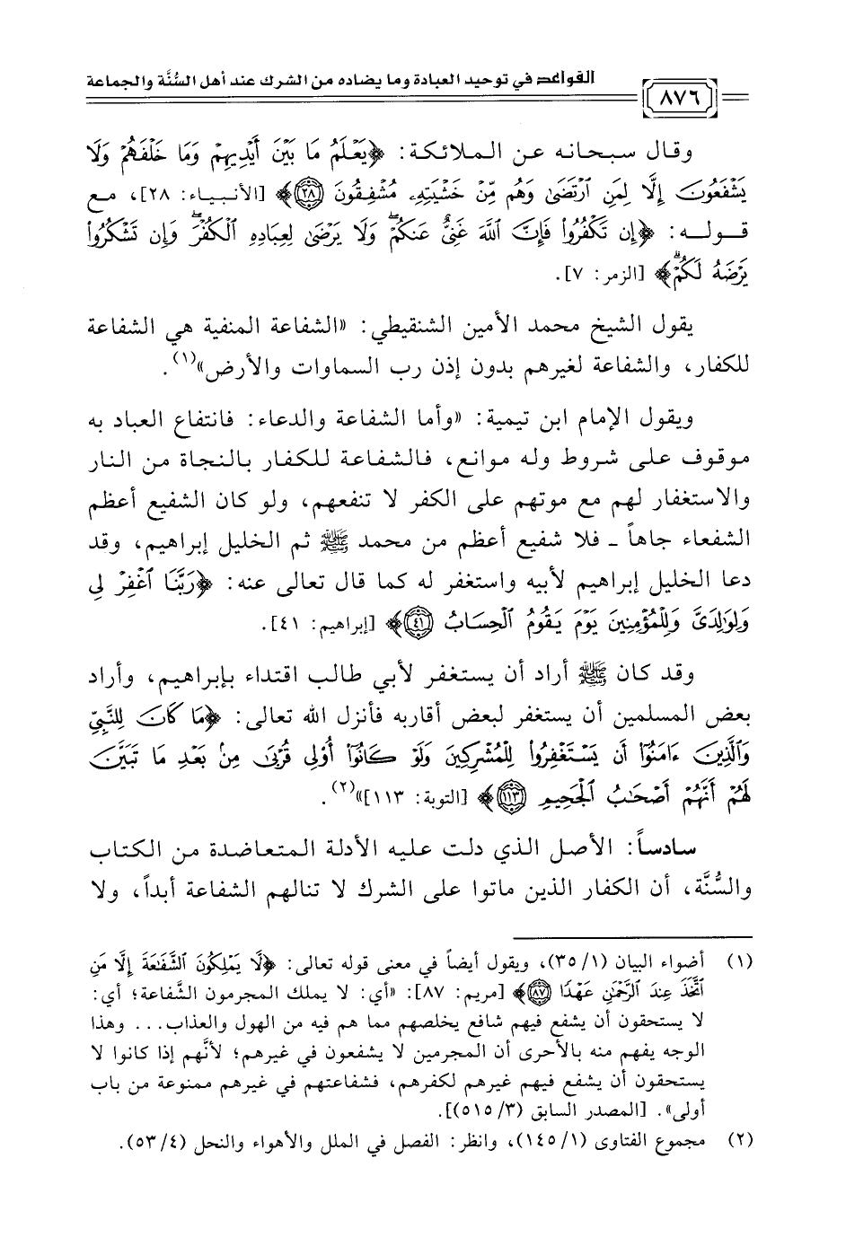 (¬١) أضواء البيان (١/ ٣٥)، ويقول أيضًا في معنى قوله تعالى: {لَا يَمْلِكُونَ الشَّفَاعَةَ إِلَّا مَنِ اتَّخَذَ عِنْدَ الرَّحْمَنِ عَهْدًا (٨٧)} [مريم: ٨٧]: "أي: لا يملك المجرمون الشَّفاعة؛ أي: لا يستحقون أن يشفع فيهم شافع يخلصهم مما هم فيه من الهول والعذاب ... وهذا الوجه يفهم منه بالأحرى أن المجرمين لا يشفعون في غيرهم؛ لأنَّهم إذا كانوا لا يستحقون أن يشفع فيهم غيرهم لكفرهم، فشفاعتهم في غيرهم ممنوعة من باب أولى". [المصدر السابق (٣/ ٥١٥)].