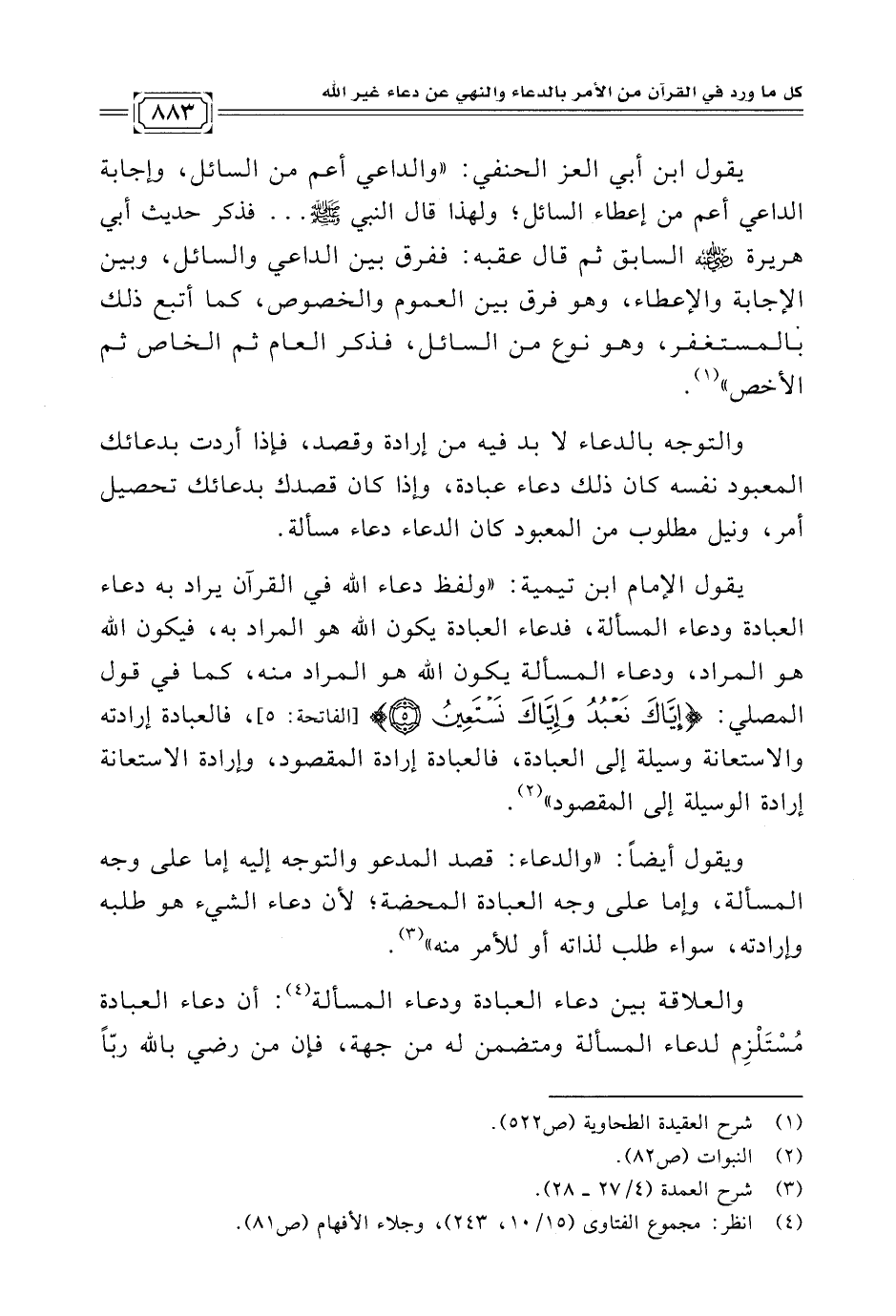 ويقول أيضًا: "والدعاء: قصد المدعو والتوجه إليه إما على وجه المسألة، وإما على وجه العبادة المحضة؛ لأن دعاء الشيء هو طلبه وإرادته، سواء طلب لذاته أو للأمر منه" (¬٣).