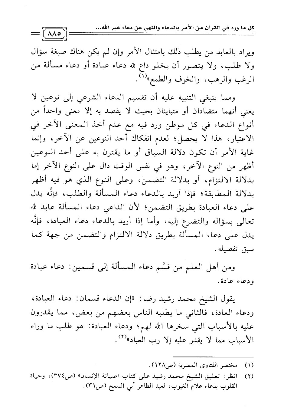 يقول الشيخ محمد رشيد رضا: "إن الدعاء قسمان: دعاء العبادة، ودعاء العادة، فالثاني ما يطلبه الناس بعضهم من بعض، مما يقدرون عليه بالأسباب التي سخرها الله لهم، ودعاء العبادة: هو طلب ما وراء الأسباب مما لا يقدر عليه إلا رب العباد" (¬٢).