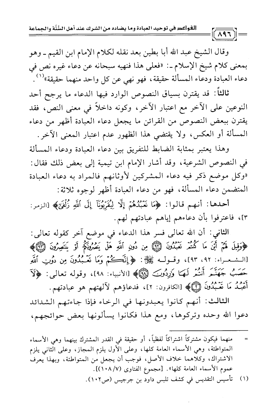 وقال الشيخ عبد الله أبا بطين بعد نقله لكلام الإمام ابن القيم -وهو بمعنى كلام شيخ الإسلام-: "فعلى هذا فنهيه سبحانه عن دعاء غيره نص في دعاء العبادة ودعاء المسألة حقيقة، فهو نهي عن كل واحد منهما حقيقة" (¬١).