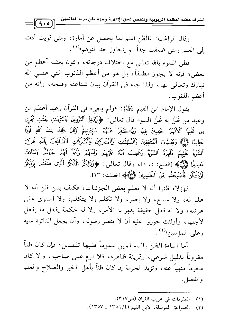 يقول الإمام ابن القيم رحمه الله: "ولم يجيء في القرآن وعيد أعظم من وعيد من ظَنَّ به ظَنَّ السوء قال تعالى: {لِيُدْخِلَ الْمُؤْمِنِينَ وَالْمُؤْمِنَاتِ جَنَّاتٍ تَجْرِي مِنْ تَحْتِهَا الْأَنْهَارُ خَالِدِينَ فِيهَا وَيُكَفِّرَ عَنْهُمْ سَيِّئَاتِهِمْ وَكَانَ ذَلِكَ عِنْدَ اللَّهِ فَوْزًا عَظِيمًا (٥) وَيُعَذِّبَ الْمُنَافِقِينَ وَالْمُنَافِقَاتِ وَالْمُشْرِكِينَ وَالْمُشْرِكَاتِ الظَّانِّينَ بِاللَّهِ ظَنَّ السَّوْءِ عَلَيْهِمْ دَائِرَةُ السَّوْءِ وَغَضِبَ اللَّهُ عَلَيْهِمْ وَلَعَنَهُمْ وَأَعَدَّ لَهُمْ جَهَنَّمَ وَسَاءَتْ مَصِيرًا (٦)} [الفتح: ٥، ٦]، وقال تعالى: {وَذَلِكُمْ ظَنُّكُمُ الَّذِي ظَنَنْتُمْ بِرَبِّكُمْ أَرْدَاكُمْ فَأَصْبَحْتُمْ مِنَ الْخَاسِرِينَ (٢٣)} [فصلت: ٢٣].