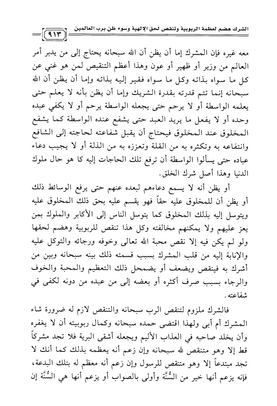 أو يظن أنه لا يسمع دعاءهم لبعده عنهم حتى يرفع الوسائط ذلك أو يظن أن للمخلوق عليه حقًا فهو يقسم عليه بحق ذلك المخلوق عليه ويتوسل إليه بذلك المخلوق كما يتوسل الناس إلى الأكابر والملوك بمن يعز عليهم ولا يمكنهم مخالفته وكل هذا تنقص للربوبية وهضم لحقها ولو لم يكن فيه إلا نقص محبة الله تعالى وخوفه ورجائه والتوكل عليه والإنابة إليه من قلب المشرك بسبب قسمته ذلك بينه سبحانه وبين من أشرك به فينقص ويضعف أو يضمحل ذلك التعظيم والمحبة والخوف والرجاء بسبب صرف أكثره أو بعضه إلى من عبده من دونه لكفى في شفاعته.