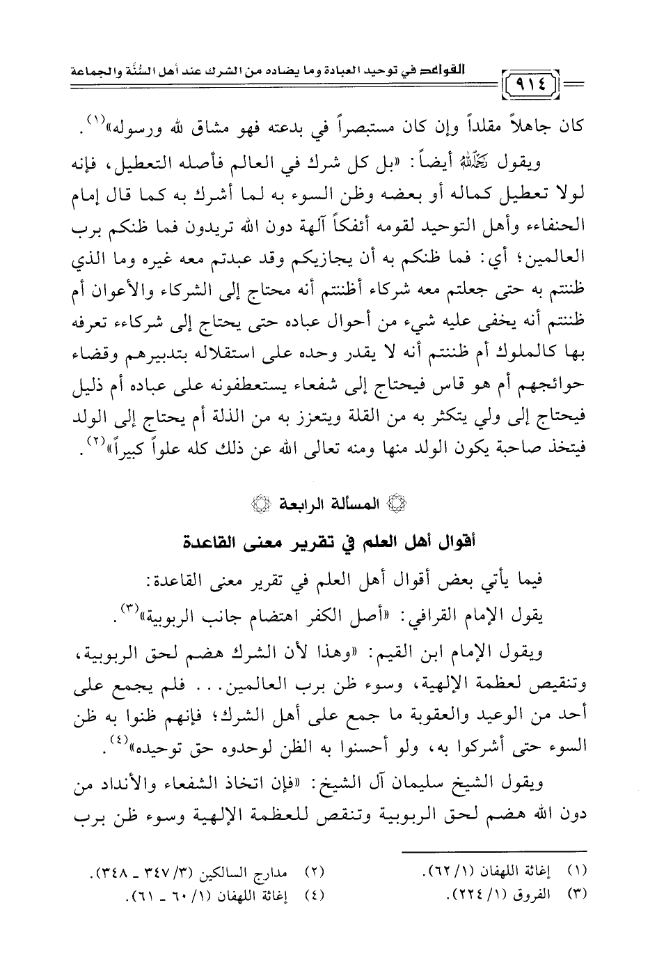 ويقول رحمه الله أيضًا: "بل كل شرك في العالم فأصله التعطيل، فإنه لولا تعطيل كماله أو بعضه وظن السوء به لما أشرك به كما قال إمام الحنفاءء وأهل التوحيد لقومه أئفكًا آلهة دون الله تريدون فما ظنكم برب العالمين؛ أي: فما ظنكم به أن يجازيكم وقد عبدتم معه غيره وما الذي ظننتم به حتى جعلتم معه شركاء أظننتم أنه محتاج إلى الشركاء والأعوان أم ظننتم أنه يخفى عليه شيء من أحوال عباده حتى يحتاج إلى شركاء تعرفه بها كالملوك أم ظننتم أنه لا يقدر وحده على استقلاله بتدبيرهم وقضاء حوائجهم أم هو قاس فيحتاج إلى شفعاء يستعطفونه على عباده أم ذليل فيحتاج إلى ولي يتكثر به من القلة ويتعزز به من الذلة أم يحتاج إلى الولد فيتخذ صاحبة يكون الولد منها ومنه تعالى الله عن ذلك كله علوًا كبيرًا" (¬٢).