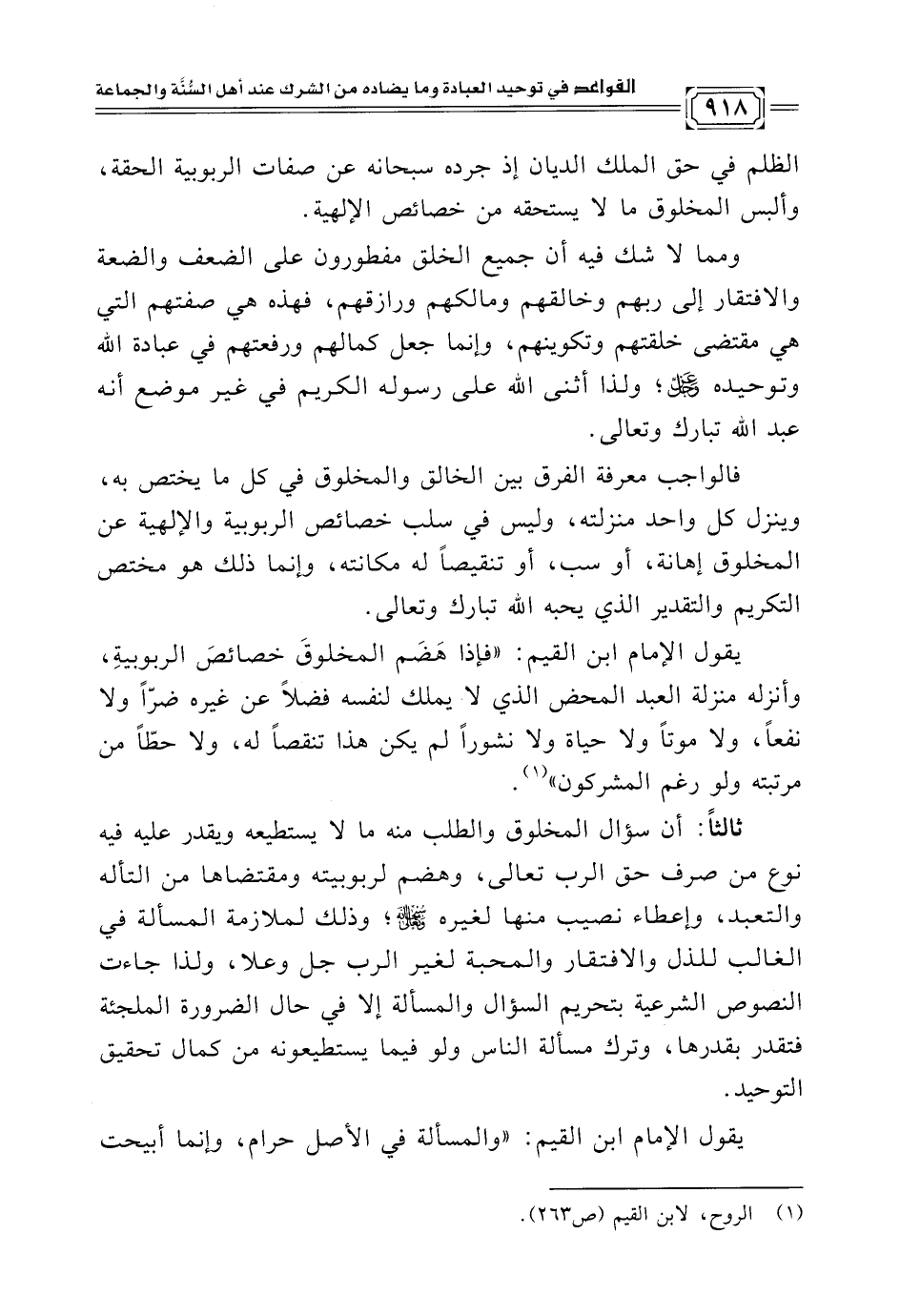 ثالثًا: أن سؤال المخلوق والطلب منه ما لا يستطيعه ويقدر عليه فيه نوع من صرف حق الرب تعالى، وهضم لربوبيته ومقتضاها من التأله والتعبد، وإعطاء نصيب منها لغيره سبحانه وتعالى؛ وذلك لملازمة المسألة في الغالب للذل والافتقار والمحبة لغير الرب جل وعلا، ولذا جاءت النصوص الشرعية بتحريم السؤال والمسألة إلا في حال الضرورة الملجئة فتقدر بقدرها، وترك مسألة الناس ولو فيما يستطيعونه من كمال تحقيق التوحيد.