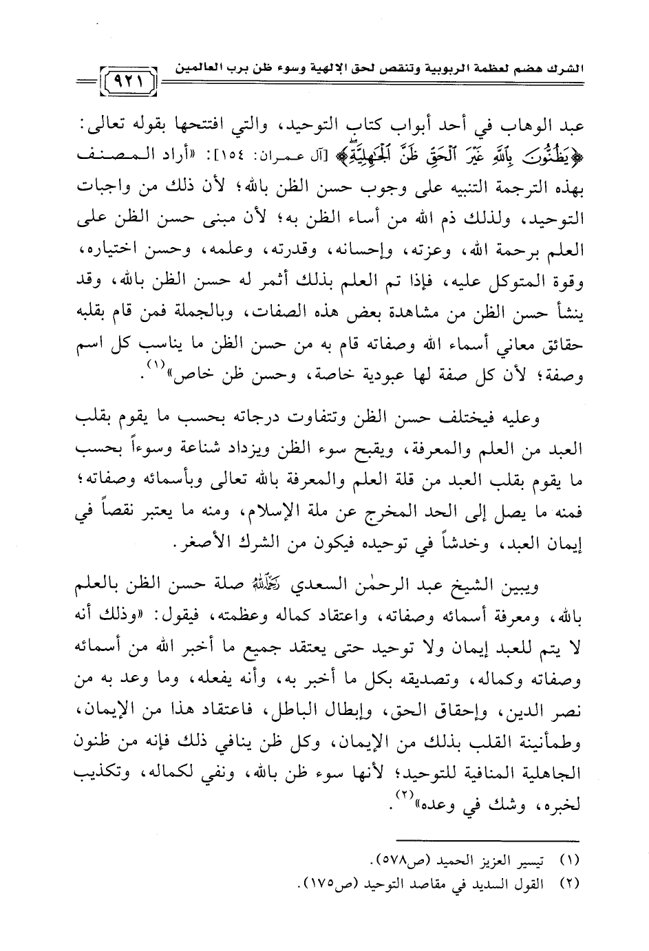 عبد الوهاب في أحد أبواب كتاب التوحيد، والتي افتتحها بقوله تعالى: {يَظُنُّونَ بِاللَّهِ غَيْرَ الْحَقِّ ظَنَّ الْجَاهِلِيَّةِ} [آل عمران: ١٥٤]: "أراد المصنف بهذه الترجمة التنبيه على وجوب حسن الظن بالله؛ لأن ذلك من واجبات التوحيد، ولذلك ذم الله من أساء الظن به؛ لأن مبنى حسن الظن على العلم برحمة الله، وعزته، وإحسانه، وقدرته، وعلمه، وحسن اختياره، وقوة المتوكل عليه، فإذا تم العلم بذلك أثمر له حسن الظن بالله، وقد ينشأ حسن الظن من مشاهدة بعض هذه الصفات، وبالجملة فمن قام بقلبه حقائق معاني أسماء الله وصفاته قام به من حسن الظن ما يناسب كل اسم وصفة؛ لأن كل صفة لها عبودية خاصة، وحسن ظن خاص" (¬١).