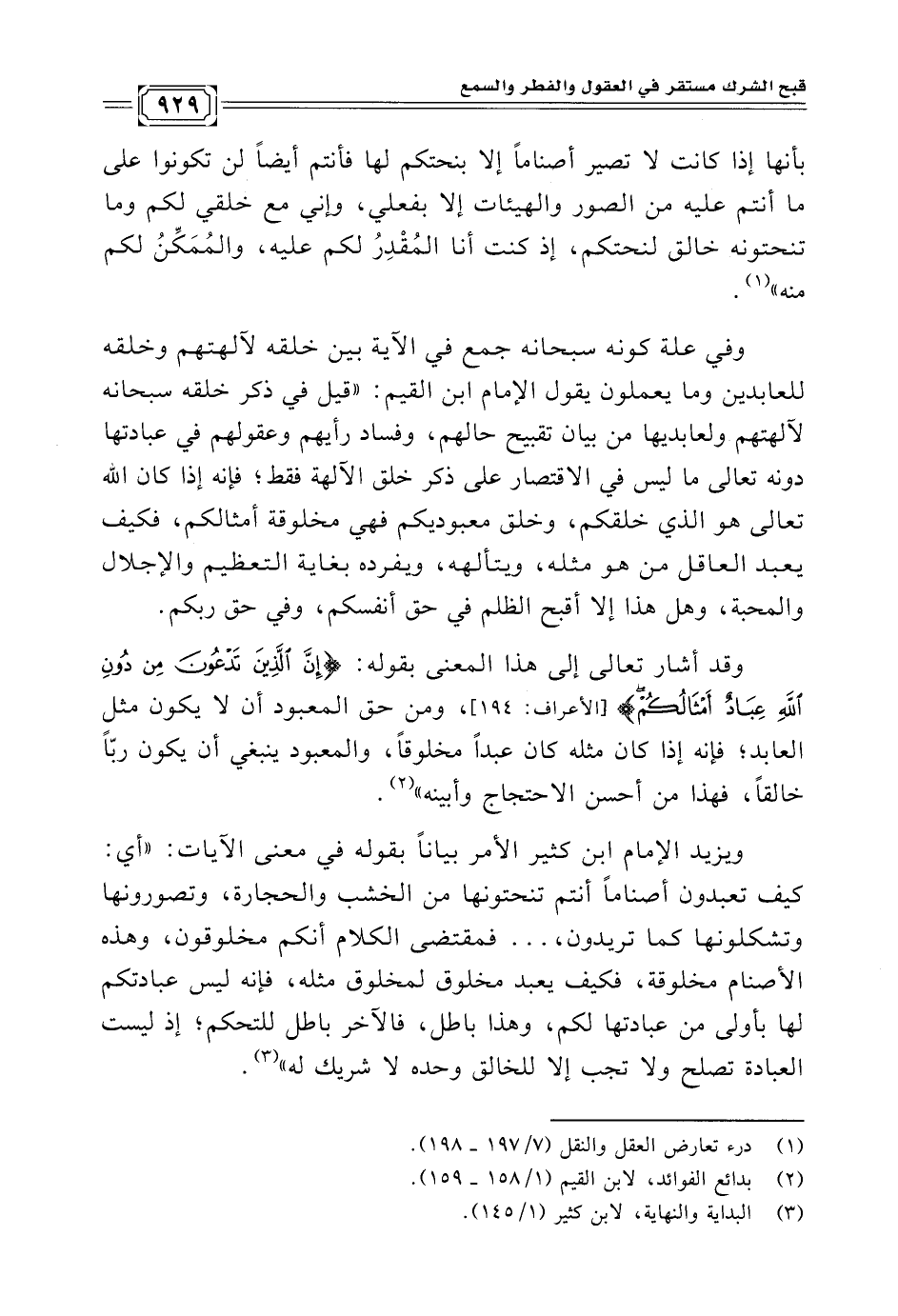 وقد أشار تعالى إلى هذا المعنى بقوله: {إِنَّ الَّذِينَ تَدْعُونَ مِنْ دُونِ اللَّهِ عِبَادٌ أَمْثَالُكُمْ} [الأعراف: ١٩٤]، ومن حق المعبود أن لا يكون مثل العابد؛ فإنه إذا كان مثله كان عبدًا مخلوقًا، والمعبود ينبغي أن يكون ربًّا خالقًا، فهذا من أحسن الاحتجاج وأبينه" (¬٢).