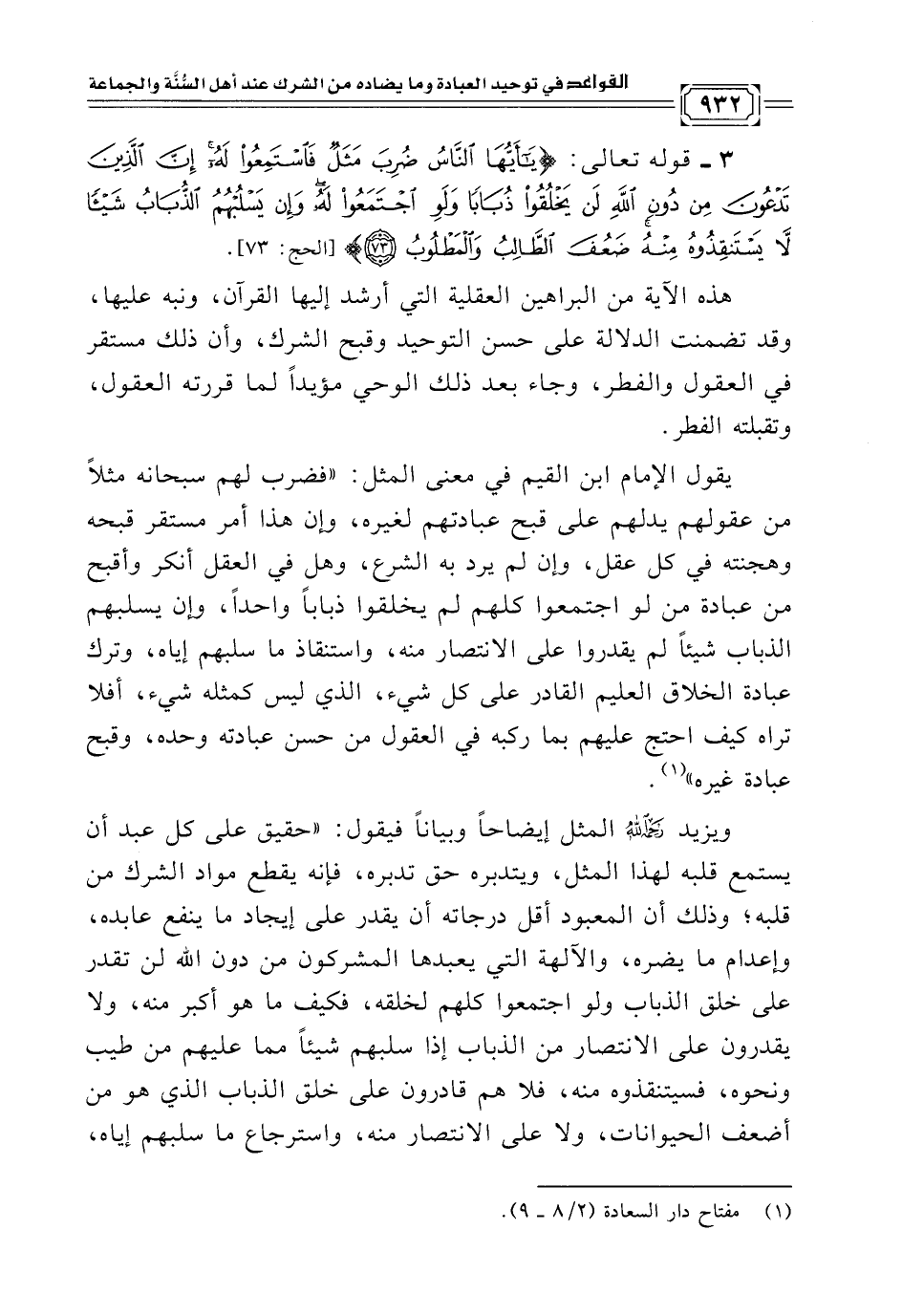 ويزيد رحمه الله المثل إيضاحًا وبيانًا فيقول: "حقيق على كل عبد أن يستمع قلبه لهذا المثل، ويتدبره حق تدبره، فإنه يقطع مواد الشرك من قلبه؛ وذلك أن المعبود أقل درجاته أن يقدر على إيجاد ما ينفع عابده، وإعدام ما يضره، والآلهة التي يعبدها المشركون من دون الله لن تقدر على خلق الذباب ولو اجتمعوا كلهم لخلقه، فكيف ما هو أكبر منه، ولا يقدرون على الانتصار من الذباب إذا سلبهم شيئًا مما عليهم من طيب ونحوه، فسيتنقذوه منه، فلا هم قادرون على خلق الذباب الذي هو من أضعف الحيوانات، ولا على الانتصار منه، واسترجاع ما سلبهم إياه،