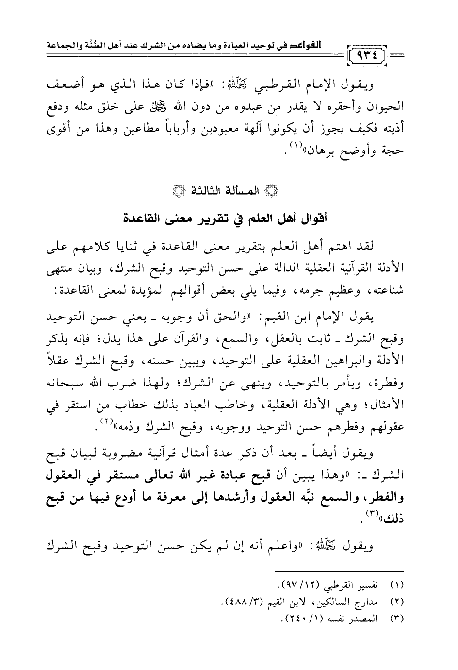 ويقول أيضًا -بعد أن ذكر عدة أمثال قرآنية مضروبة لبيان قبح الشرك-: "وهذا يبين أن قبح عبادة غير الله تعالى مستقر في العقول والفطر، والسمع نبَّه العقول وأرشدها إلى معرفة ما أودع فيها من قبح ذلك" (¬٣).