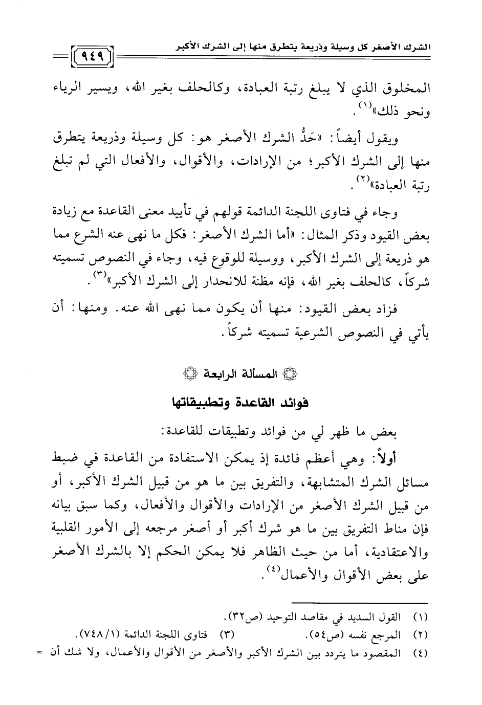 وجاء في فتاوى اللجنة الدائمة قولهم في تأييد معنى القاعدة مع زيادة بعض القيود وذكر المثال: "أما الشرك الأصغر: فكل ما نهى عنه الشرع مما هو ذريعة إلى الشرك الأكبر، ووسيلة للوقوع فيه، وجاء في النصوص تسميته شركًا، كالحلف بغير الله، فإنه مظنة للانحدار إلى الشرك الأكبر" (¬٣).