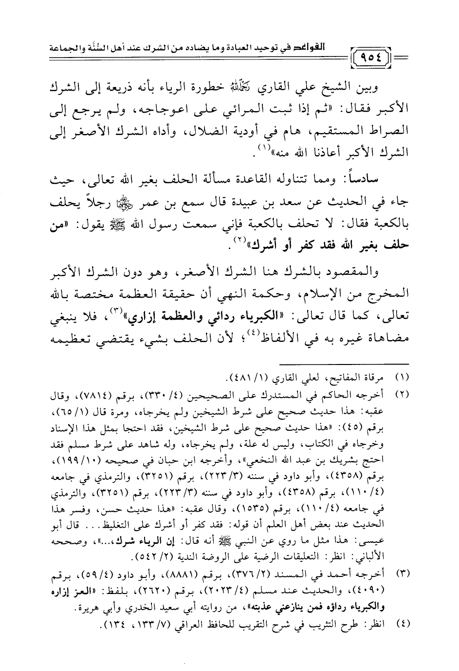 والمقصود بالشرك هنا الشرك الأصغر، وهو دون الشرك الأكبر المخرج من الإسلام، وحكمة النهي أن حقيقة العظمة مختصة بالله تعالى، كما قال تعالى: "الكبرياء ردائي والعظمة إزاري" (¬٣)، فلا ينبغي مضاهاة غيره به في الألفاظ (¬٤)؛ لأن الحلف بشيء يقتضي تعظيمه