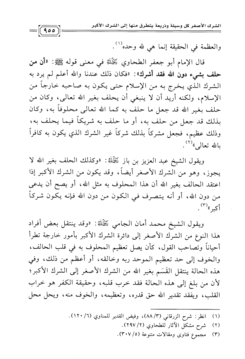 قال الإمام أبو جعفر الطحاوي -رحمه الله- في معنى قوله -صلى الله عليه وسلم-: "أن من حلف بشيء دون الله فقد أشرك": "فكان ذلك عندنا والله أعلم لم يرد به الشرك الذي يخرج به من الإسلام حتى يكون به صاحبه خارجًا من الإسلام، ولكنه أريد أن لا ينبغي أن يحلف بغير الله تعالى، وكان من حلف بغير الله قد جعل ما حلف به كما الله تعالى محلوفًا به، وكان بذلك قد جعل من حلف به، أوما حلف به شريكًا فيما يحلف به، وذلك عظيم، فجعل مشركًا بذلك شركًا غير الشرك الذي يكون به كافرًا بالله تعالى" (¬٢).