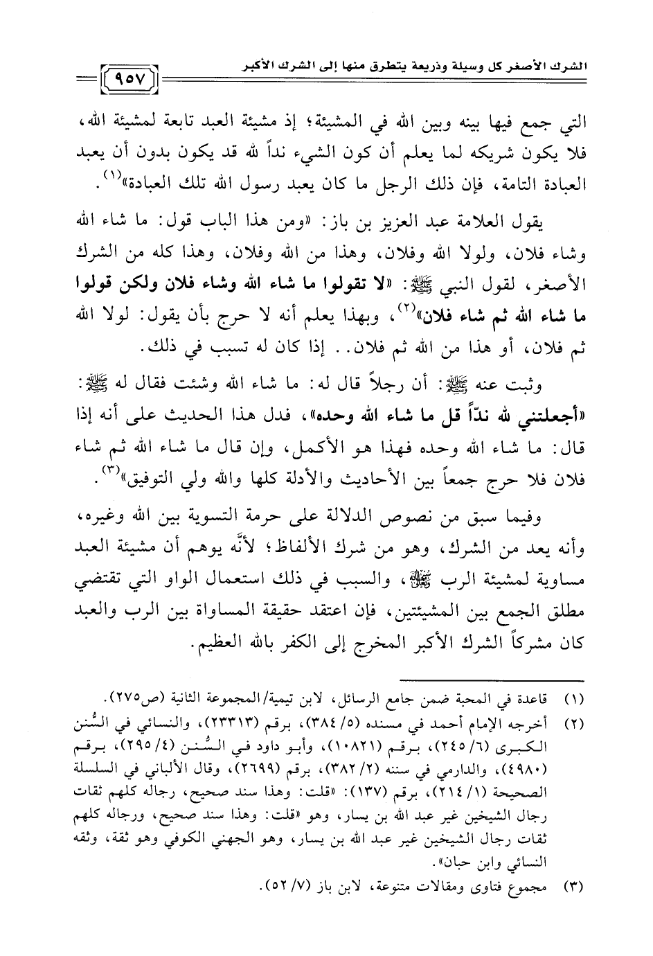 يقول العلامة عبد العزيز بن باز: "ومن هذا الباب قول: ما شاء الله وشاء فلان، ولولا الله وفلان، وهذا من الله وفلان، وهذا كله من الشرك الأصغر، لقول النبي -صلى الله عليه وسلم-: "لا تقولوا ما شاء الله وشاء فلان ولكن قولوا ما شاء الله ثم شاء فلان" (¬٢)، وبهذا يعلم أنه لا حرج بأن يقول: لولا الله ثم فلان، أو هذا من الله ثم فلان .. إذا كان له تسبب في ذلك.