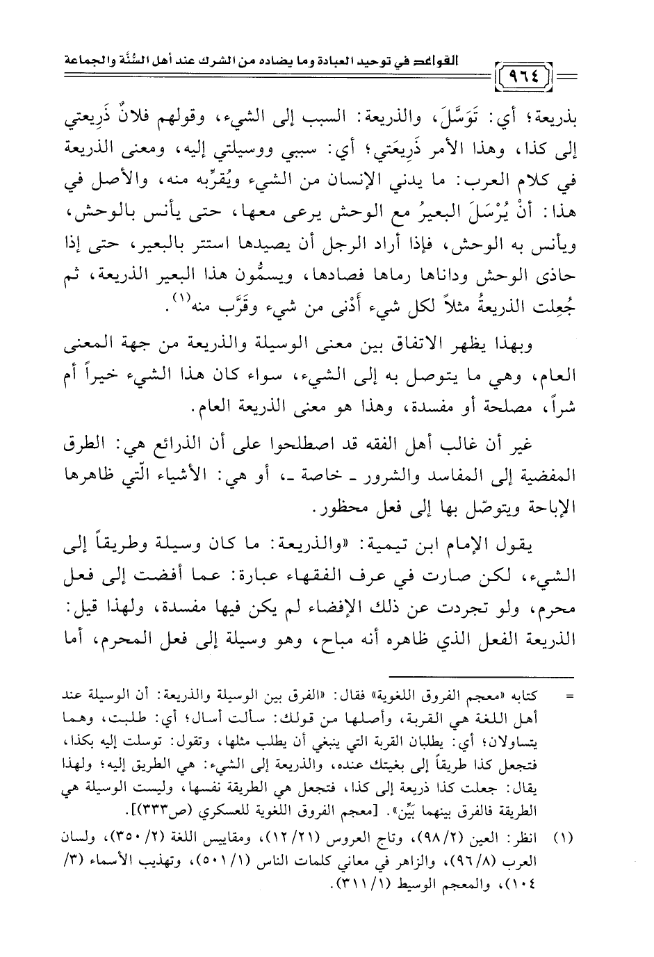 = كتابه "معجم الفروق اللغوية" فقال: "الفرق بين الوسيلة والذريعة: أن الوسيلة عند أهل اللغة هي القربة، وأصلها من قولك: سألت أسال؛ أي: طلبت، وهما يتساولان؛ أي: يطلبان القربة التي ينبغي أن يطلب مثلها، وتقول: توسلت إليه بكذا، فتجعل كذا طريقًا إلى بغيتك عنده، والذريعة إلى الشيء: هي الطريق إليه؛ ولهذا يقال: جعلت كذا ذريعة إلى كذا، فتجعل هي الطريقة نفسها، وليست الوسيلة هي الطريقة فالفرق بينهما بَيِّن". [معجم الفروق اللغوية للعسكري (ص ٣٣٣)].