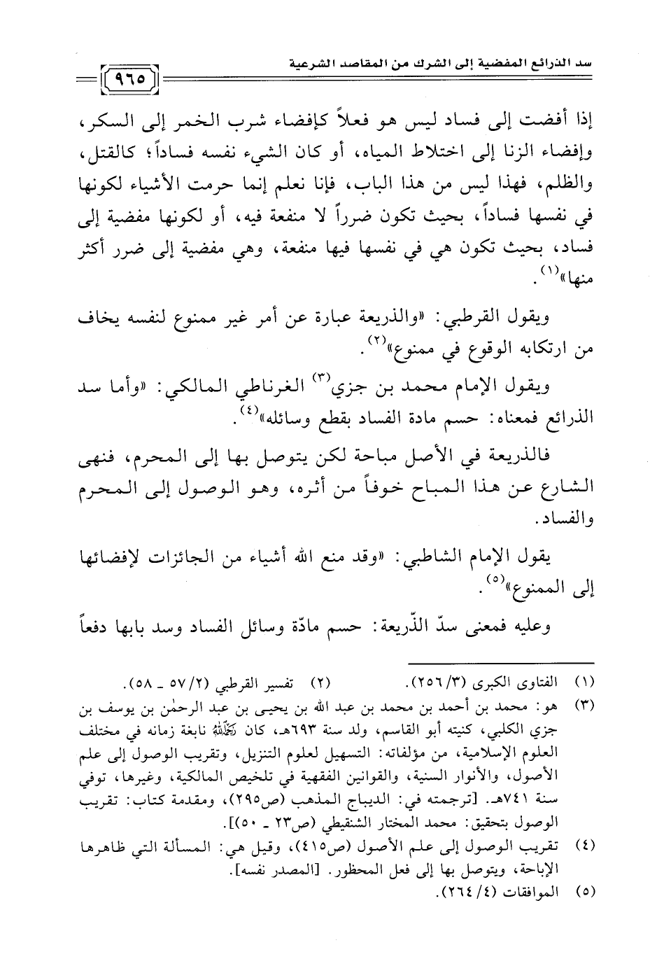 ويقول الإمام محمد بن جزي (¬٣) الغرناطي المالكي: "وأما سد الذرائع فمعناه: حسم مادة الفساد بقطع وسائله" (¬٤).
