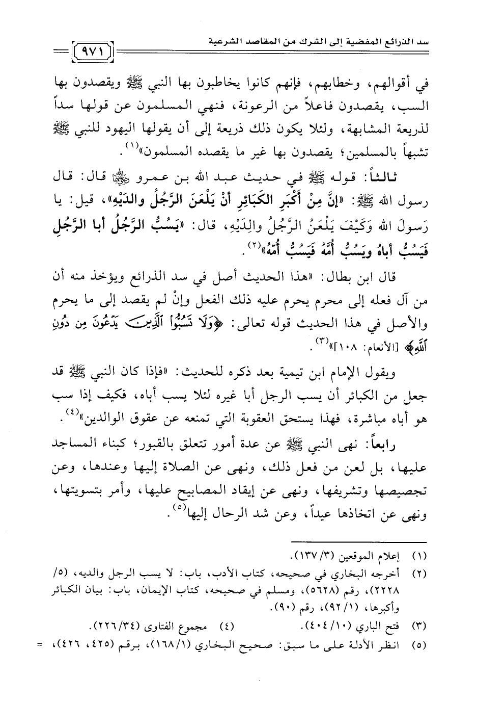 قال ابن بطال: "هذا الحديث أصل في سد الذرائع ويؤخذ منه أن من آل فعله إلى محرم يحرم عليه ذلك الفعل وإنْ لم يقصد إلى ما يحرم والأصل في هذا الحديث قوله تعالى {وَلَا تَسُبُّوا الَّذِينَ يَدْعُونَ مِنْ دُونِ اللَّهِ} [الأنعام: ١٠٨] " (¬٣).