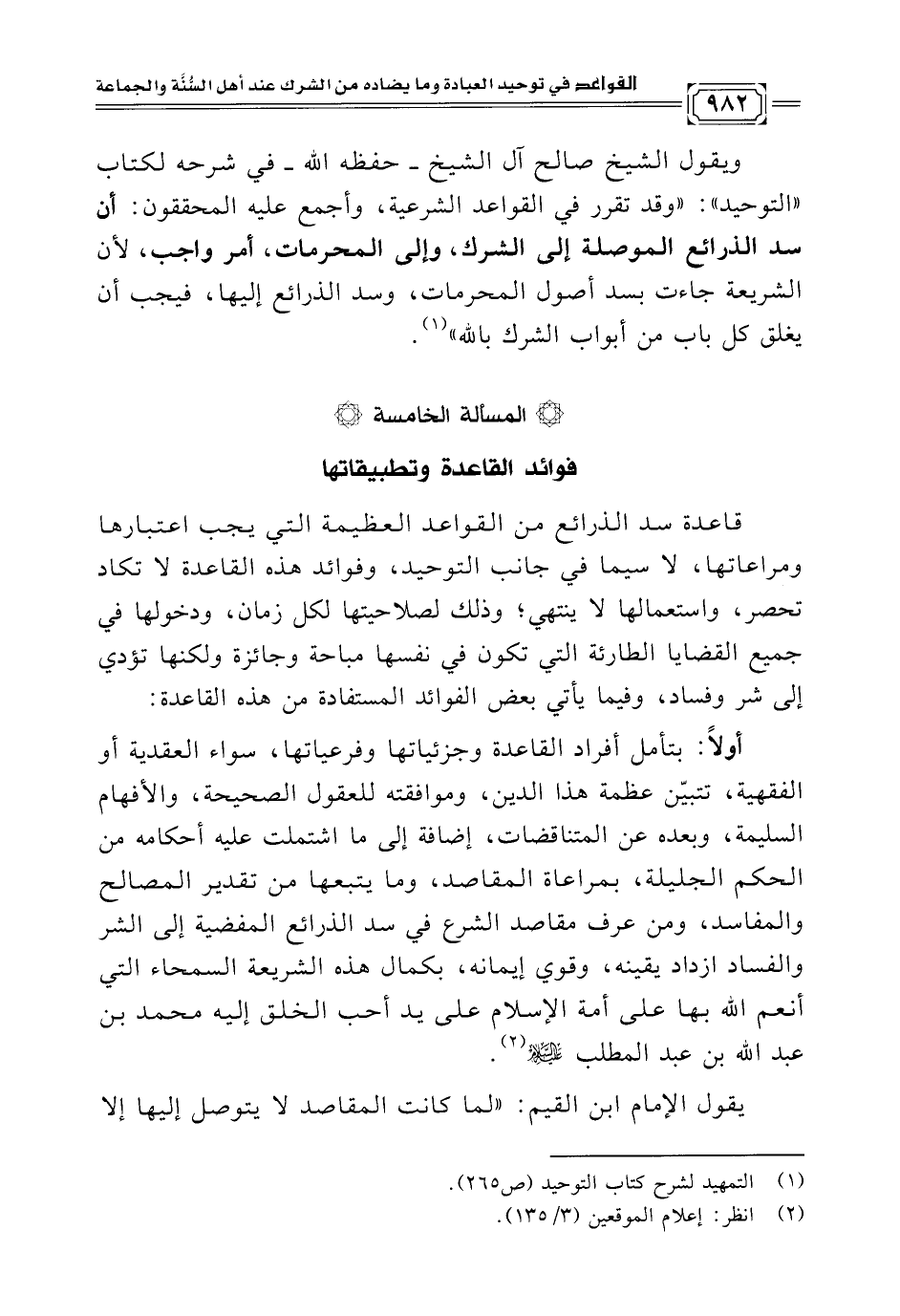 ويقول الشيخ صالح آل الشيخ -حفظه الله- في شرحه لكتاب "التوحيد": "وقد تقرر في القواعد الشرعية، وأجمع عليه المحققون: أن سد الذرائع الموصلة إلى الشرك، وإلى المحرمات، أمر واجب، لأن الشريعة جاءت بسد أصول المحرمات، وسد الذرائع إليها، فيجب أن يغلق كل باب من أبواب الشرك بالله" (¬١).