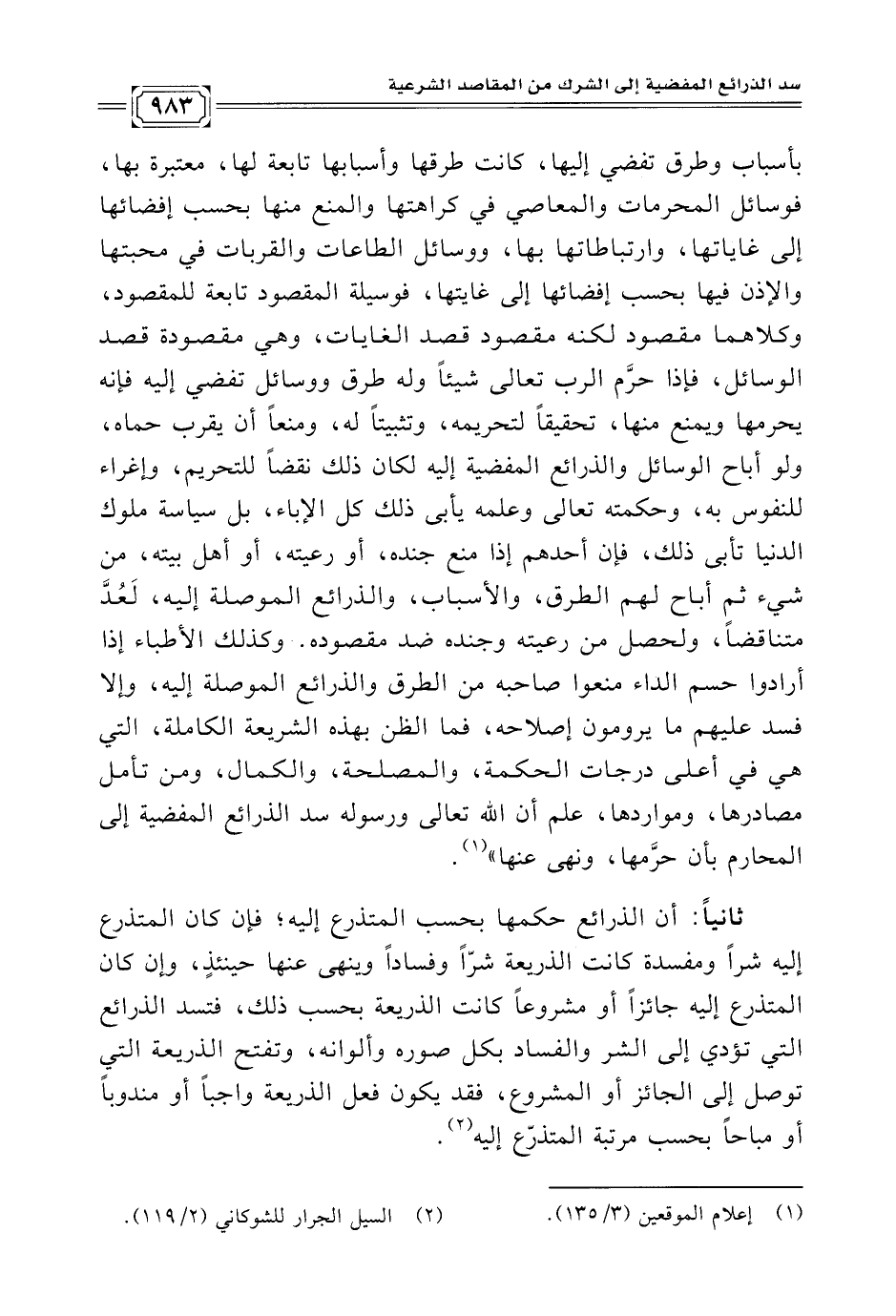 ثانيًا: أن الذرائع حكمها بحسب المتذرع إليه؛ فإن كان المتذرع إليه شرًا ومفسدة كانت الذريعة شرًّا وفسادًا وينهى عنها حينئذٍ، وإن كان المتذرع إليه جائزًا أو مشروعًا كانت الذريعة بحسب ذلك، فتسد الذرائع التي تؤدي إلى الشر والفساد بكل صوره وألوانه، وتفتح الذريعة التي توصل إلى الجائز أو المشروع، فقد يكون فعل الذريعة واجبًا أو مندوبًا أو مباحًا بحسب مرتبة المتذرّع إليه (¬٢).