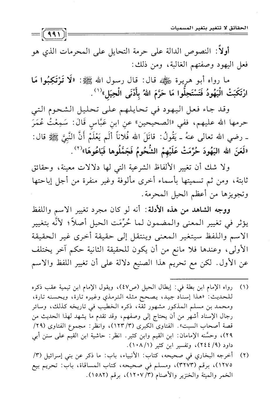 ووجه الشاهد من هذه الأدلة: أنه لو كان مجرد تغيير الاسم واللفظ يؤثر في تغيير المعنى والمضمون لما حُرِّمَت الحيل أصلًا؛ لأنَّه بتغيير الاسم واللفظ سيتغير المعنى وينتقل إلى حقيقة أخرى غير الحقيقة الأولى، وعندها فلا مانع من أن يكون للحقيقة الثانية حكم آخر يختلف عن الأول. لكن مع تحريم هذا الصنيع دلالة على أن تغيير اللفظ والاسم