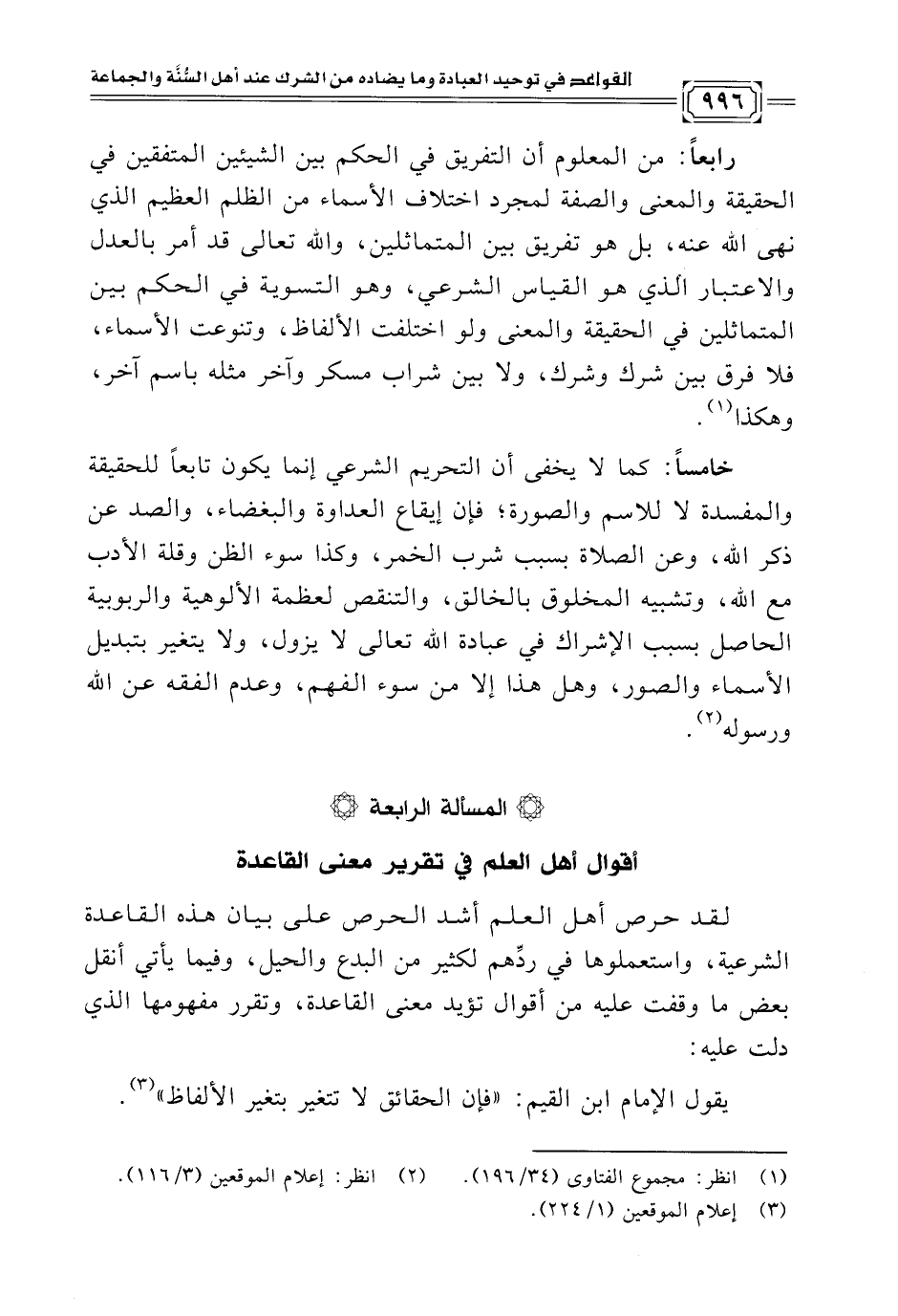 رابعًا: من المعلوم أن التفريق في الحكم بين الشيئين المتفقين في الحقيقة والمعنى والصفة لمجرد اختلاف الأسماء من الظلم العظيم الذي نهى الله عنه، بل هو تفريق بين المتماثلين، والله تعالى قد أمر بالعدل والاعتبار الذي هو القياس الشرعي، وهو التسوية في الحكم بين المتماثلين في الحقيقة والمعنى ولو اختلفت الألفاظ، وتنوعت الأسماء، فلا فرق بين شرك وشرك، ولا بين شراب مسكر وآخر مثله باسم آخر، وهكذا (¬١).