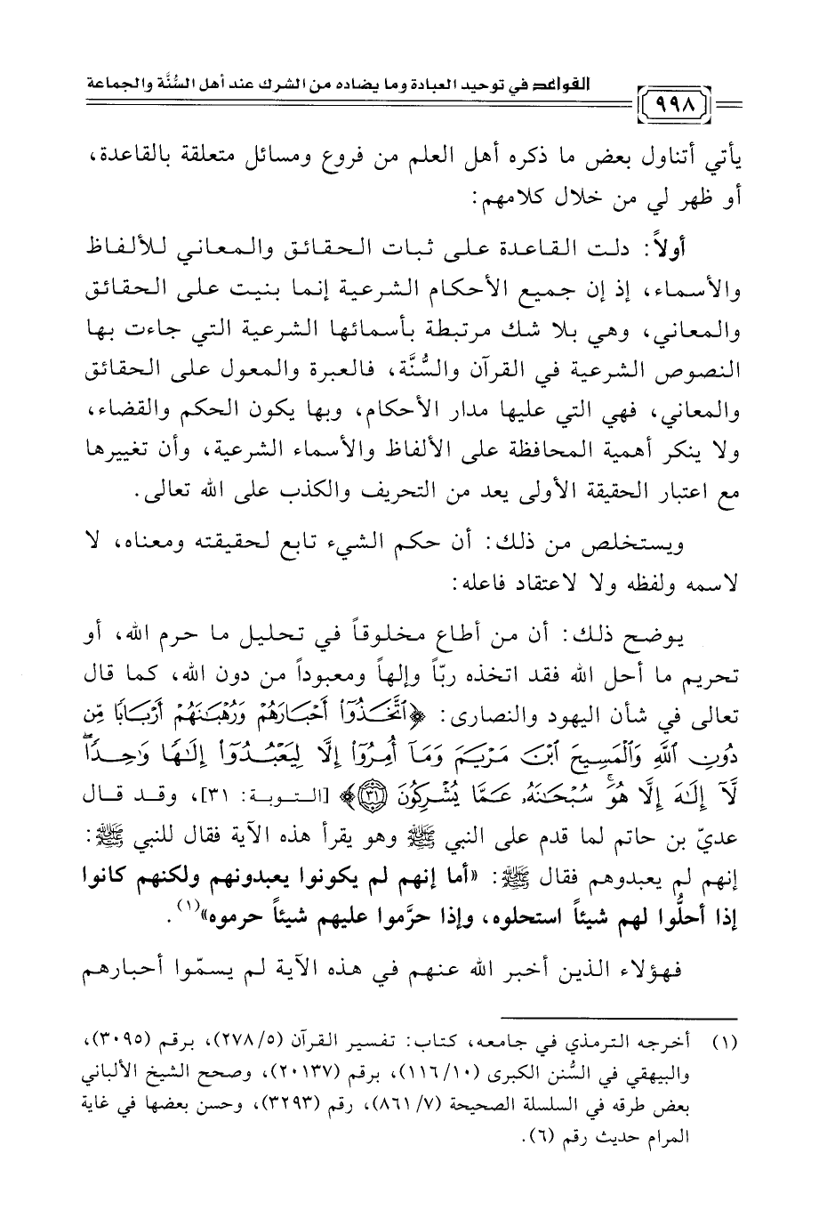 ويستخلص من ذلك: أن حكم الشيء تابع لحقيقته ومعناه، لا لاسمه ولفظه ولا لاعتقاد فاعله: يوضح ذلك: أن من أطاع مخلوقًا في تحليل ما حرم الله، أو تحريم ما أحل الله فقد اتخذه ربًّا وإلهًا ومعبودًا من دون الله، كما قال تعالى في شأن اليهود والنصارى: {اتَّخَذُوا أَحْبَارَهُمْ وَرُهْبَانَهُمْ أَرْبَابًا مِنْ دُونِ اللَّهِ وَالْمَسِيحَ ابْنَ مَرْيَمَ وَمَا أُمِرُوا إِلَّا لِيَعْبُدُوا إِلَهًا وَاحِدًا لَا إِلَهَ إِلَّا هُوَ سُبْحَانَهُ عَمَّا يُشْرِكُونَ (٣١)} [التوبة: ٣١]، وقد قال عديّ بن حاتم لما قدم على النبي - صلى الله عليه وسلم - وهو يقرأ هذه الآية فقال للنبي - صلى الله عليه وسلم -: إنهم لم يعبدوهم فقال -صلى الله عليه وسلم-: "أما إنهم لم يكونوا يعبدونهم ولكنهم كانوا إذا أحلُّوا لهم شيئًا استحلوه، وإذا حرَّموا عليهم شيئًا حرموه" (¬١).