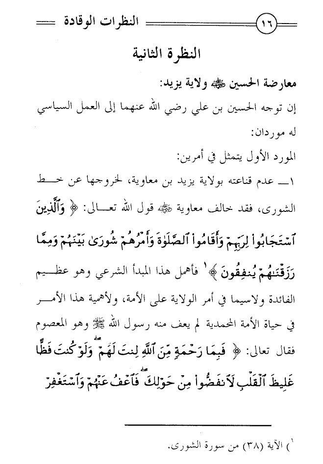 1 ـ عدم قناعته بولاية يزيد بن معاوية، لخروجها عن خط الشورى، فقد خالف معاوية - رضي الله عنه - قول الله تعالى: {وَالَّذِينَ اسْتَجَابُوا لِرَبِّهِمْ وَأَقَامُوا الصَّلَاةَ وَأَمْرُهُمْ شُورَى بَيْنَهُمْ وَمِمَّا رَزَقْنَاهُمْ يُنْفِقُونَ} (¬1) فأهمل هذا المبدأ الشرعي وهو عظيم الفائدة ولاسيما في أمر الولاية على الأمة، ولأهمية هذا الأمر في حياة الأمة المحمدية لم يعف منه رسول الله - صلى الله عليه وسلم - وهو المعصوم فقال تعالى: {فَبِمَا رَحْمَةٍ مِنَ اللَّهِ لِنْتَ لَهُمْ وَلَوْ كُنْتَ فَظًّا غَلِيظَ الْقَلْبِ لَانْفَضُّوا مِنْ حَوْلِكَ فَاعْفُ عَنْهُمْ وَاسْتَغْفِرْ