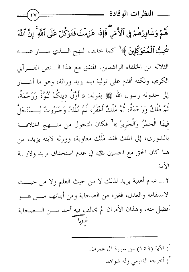 لَهُمْ وَشَاوِرْهُمْ فِي الْأَمْرِ فَإِذَا عَزَمْتَ فَتَوَكَّلْ عَلَى اللَّهِ إِنَّ اللَّهَ يُحِبُّ الْمُتَوَكِّلِينَ} (¬1) كما خالف النهج الذي سار عليه الثلاثة من الخلفاء الراشدين، المتفق مع هذا النص القرآني الكريم، ولكنه أقدم على تولية ابنه يزيد وراثة، وهو ما أشار إلى حدوثه رسول الله - صلى الله عليه وسلم - بقوله: «أَوَّلُ دِينِكُمْ نُبُوَّةٌ وَرَحْمَةٌ، ثُمَّ مُلْكٌ وَرَحْمَةٌ، ثُمَّ مُلْكٌ أَعْفَرُ، ثُمَّ مُلْكٌ وَجَبَرُوتٌ يُسْتَحَلُّ فِيهَا الْخَمْرُ وَالْحَرِيرُ» (¬2) فكان التحول من منهج الخلافة بالشورى، إلى الملك فقد مَلَك معاوية، وورثه لابنه يزيد، من هنا كان الحق مع الحسين - رضي الله عنه - في عدم استحقاق يزيد ولاية الأمة.