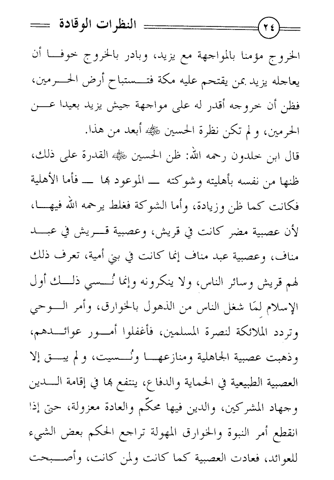قال ابن خلدون رحمه الله: ظن الحسين - رضي الله عنه - القدرة على ذلك، ظنها من نفسه بأهليته وشوكته ـ الموعود بها ـ فأما الأهلية فكانت كما ظن وزيادة، وأما الشوكة فغلط يرحمه الله فيها، لأن عصبية مضر كانت في قريش، وعصبية قريش في عبد مناف، وعصبية عبد مناف إنما كانت في بني أمية، تعرف ذلك لهم قريش وسائر الناس، ولا ينكرونه وإنما نُسي ذلك أول الإسلام لِمَا شغل الناس من الذهول بالخوارق، وأمر الوحي وتردد الملائكة لنصرة المسلمين، فأغفلوا أمور عوائدهم، وذهبت عصبية الجاهلية ومنازعها ونُسيت، ولم يبق إلا العصبية الطبيعية في الحماية والدفاع، ينتفع بها في إقامة الدين وجهاد المشركين، والدين فيها محكّم والعادة معزولة، حتى إذا انقطع أمر النبوة والخوارق المهولة تراجع الحكم بعض الشيء للعوائد، فعادت العصبية كما كانت ولمن كانت، وأصبحت