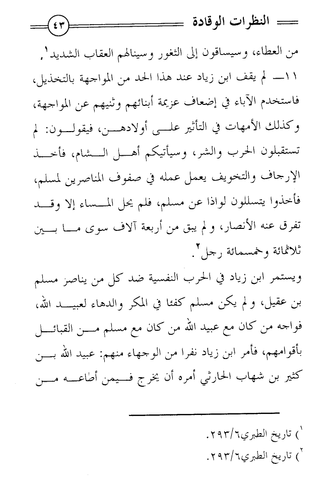 11 ـ لم يقف ابن زياد عند هذا الحد من المواجهة بالتخذيل، فاستخدم الآباء في إضعاف عزيمة أبنائهم وثنيهم عن المواجهة، وكذلك الأمهات في التأثير على أولادهن، فيقولون: لم تستقبلون الحرب والشر، وسيأتيكم أهل الشام، فأخذ الإرجاف والتخويف يعمل عمله في صفوف المناصرين لمسلم، فأخذوا يتسللون لواذا عن مسلم، فلم يحل المساء إلا وقد تفرق عنه الأنصار، ولم يبق من أربعة آلاف سوى ما بين ثلاثمائة وخمسمائة رجل (¬2).