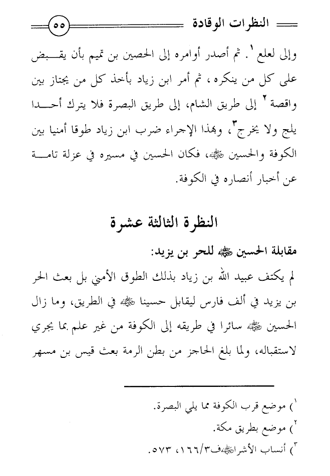 وإلى لعلع (¬1). ثم أصدر أوامره إلى الحصين بن تميم بأن يقبض على كل من ينكره، ثم أمر ابن زياد بأخذ كل من يجتاز بين واقصة (¬2)، إلى طريق الشام، إلى طريق البصرة فلا يترك أحدا يلج ولا يخرج (¬3)، وبهذا الإجراء ضرب ابن زياد طوقا أمنيا بين الكوفة والحسين - رضي الله عنه -، فكان الحسين في مسيره في عزلة تامة عن أخبار أنصاره في الكوفة.